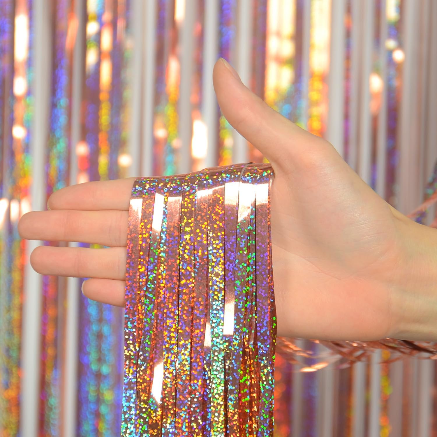 • Easy to Use: The foil curtain party decoration come with double-sided adhesive tape, easy to use, pasting on the top of wall, door or window, you can also hang it up with a rope