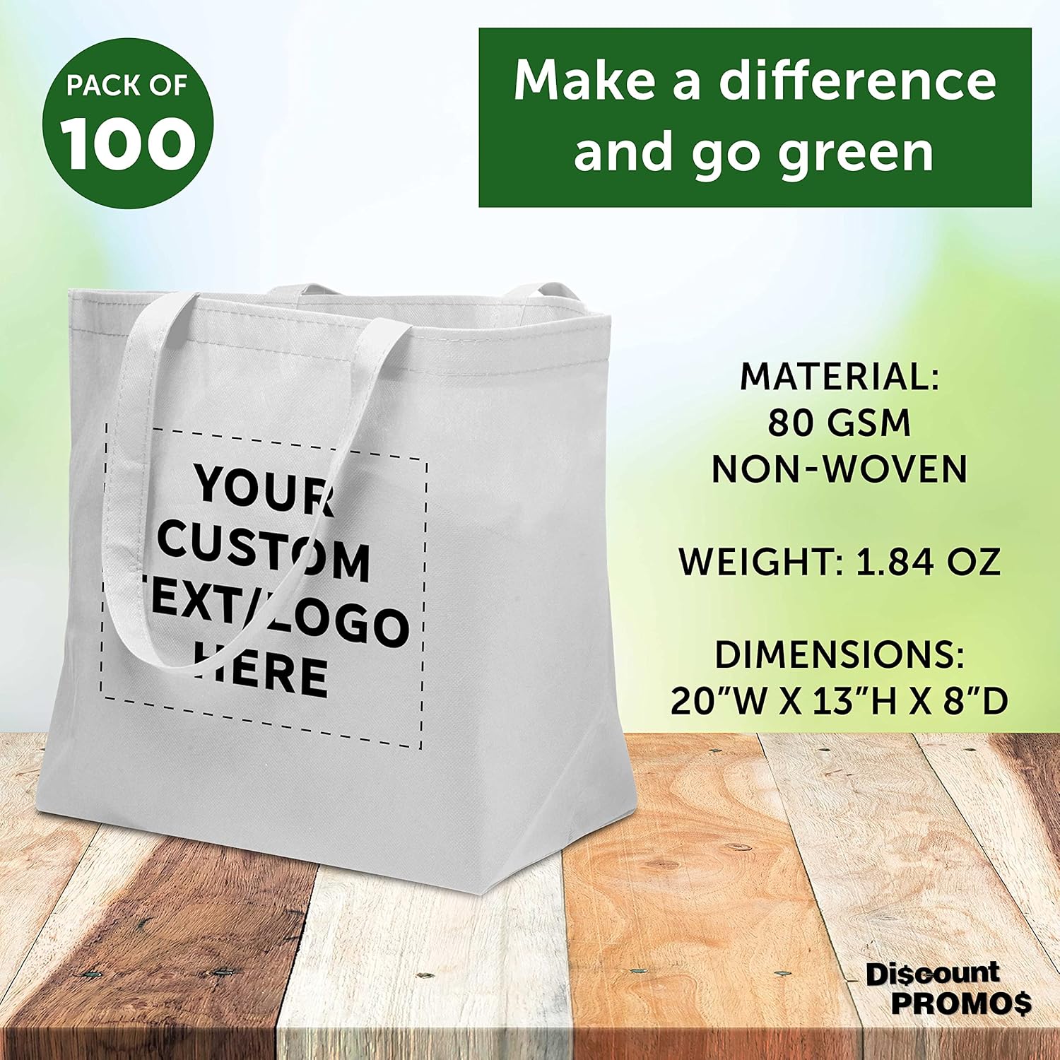 DISCOUNT PROMOS Custom Southern Style Grocery Tote Bags Set of 100 - Personalized Bulk Pack, Reusable Grocery & Shopping Bags - Great for Travel, Carry on Bag, Business Promotions - White - 20"X13"X8"