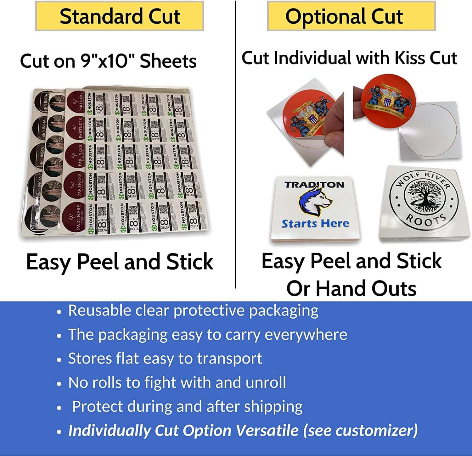 • Uniquely identify business items by adding personalized logos, text or images on the logo stickers and custom decal. Stickers are on 9x11 sheet for easy peel and stick or as a option individually cut