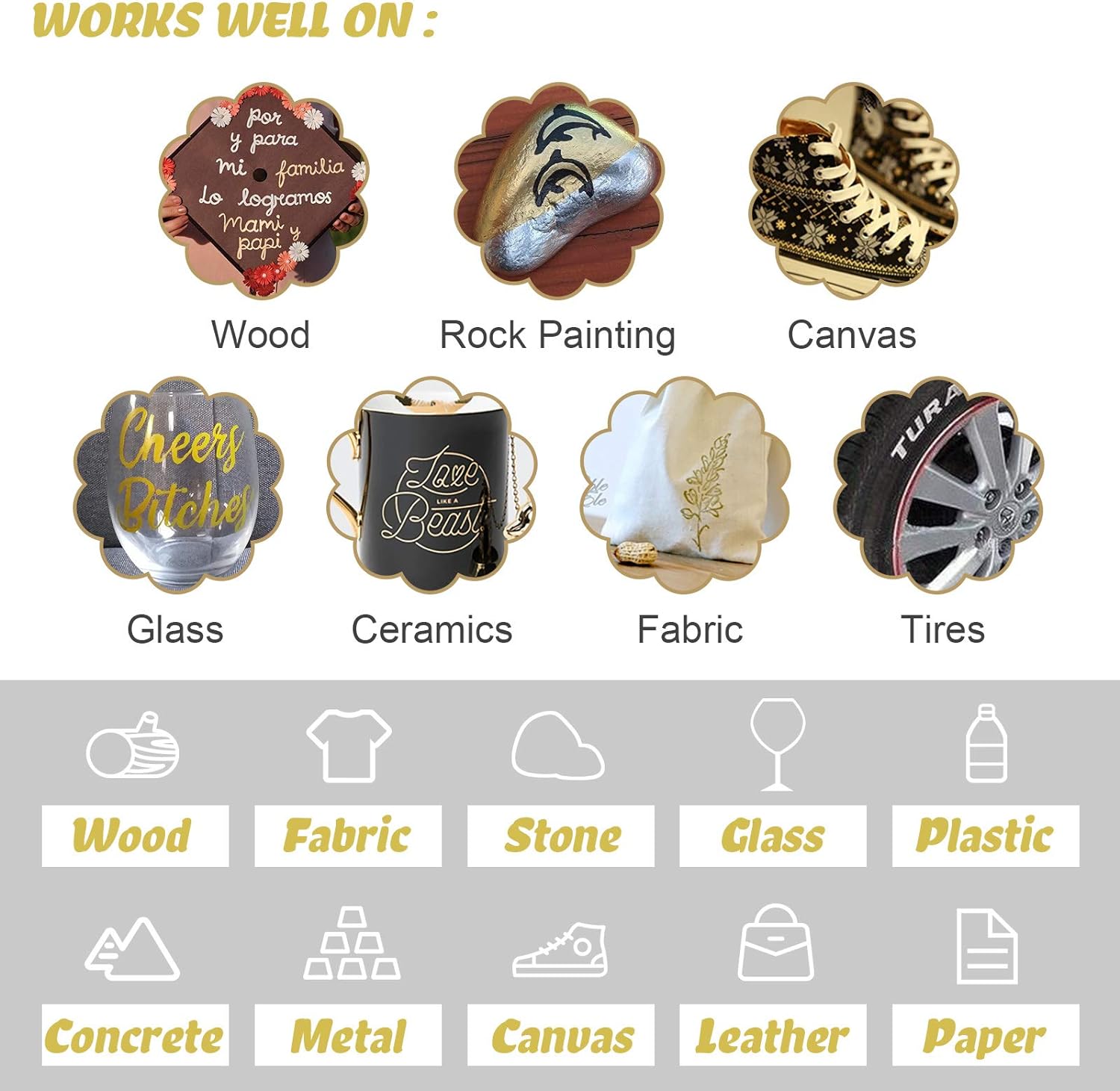 • 【High Quality and Safe】Package with 3 pcs Gold+3 pcs Silver color. Acrylic paint pens are made with high quality abundant oil ink, High purity color, strong covering force,waterproof, fade proof, non-bleeding. non-toxic, no odor, no strong smell. Conform to ASTM D-4236 & EN71-3.