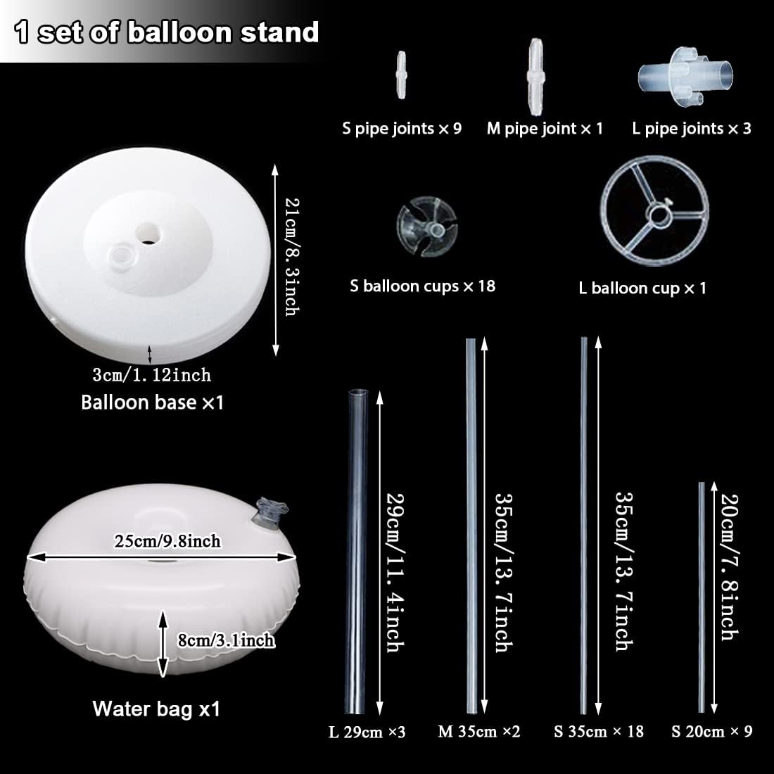 • Package includes:2 set of clear balloon stand (19 Balloon Cups,1 PVC Balloon Base,Several Balloon Sticks, several connectors ), 2 pcs fillable water bases and 1 pack balloon tying knot tool. We have added fillable water bases to make the balloon column more stability.