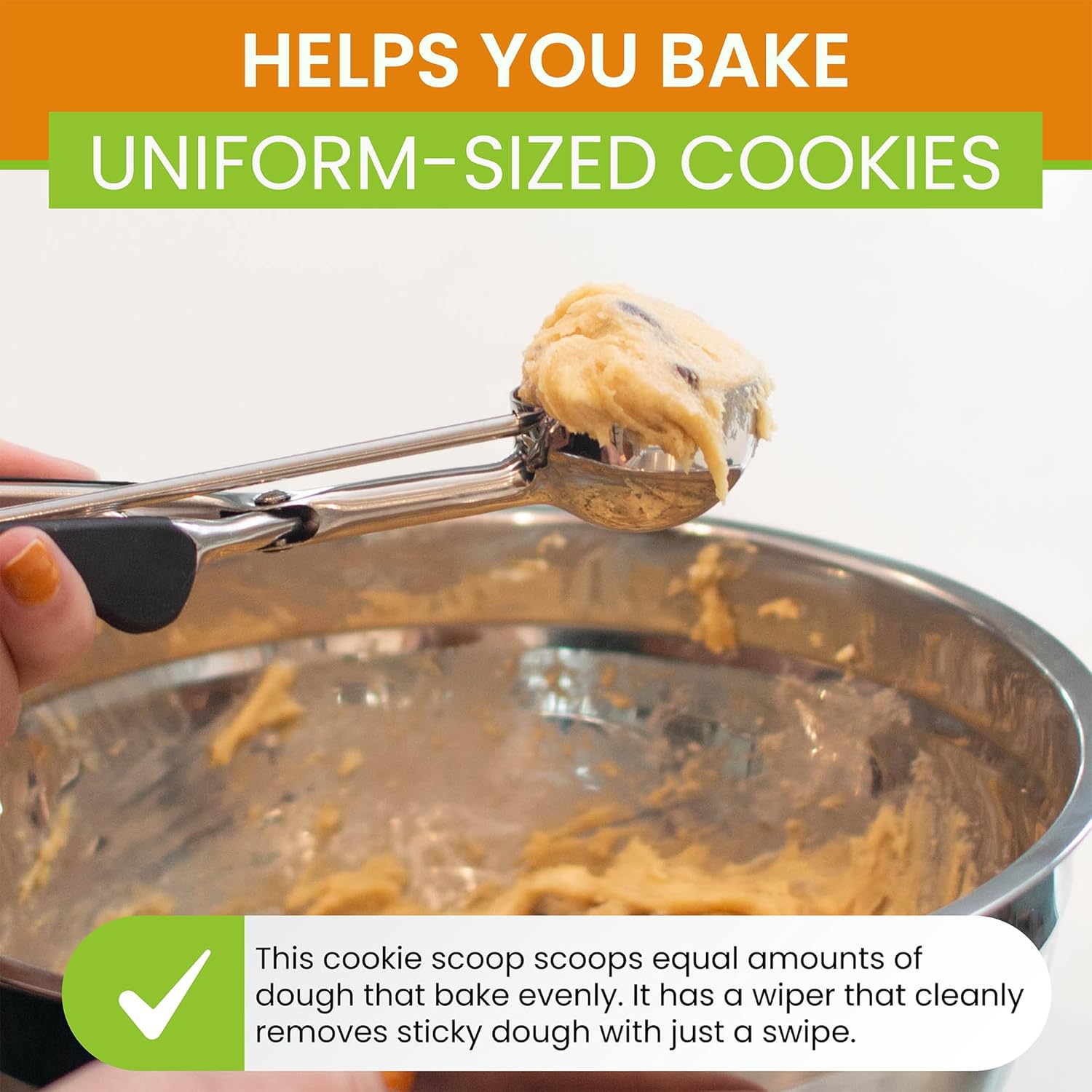 • Helps You Bake Uniform-Sized Cookies - The small size 1 tablespoon cookie scoop is size #60. This cookie baller scoop scoops batter into several pieces of equal shape and sizes. It has a wiper that cleanly removes sticky dough with just a swipe. So, you can make as many batches of cookies as you want without hassle.