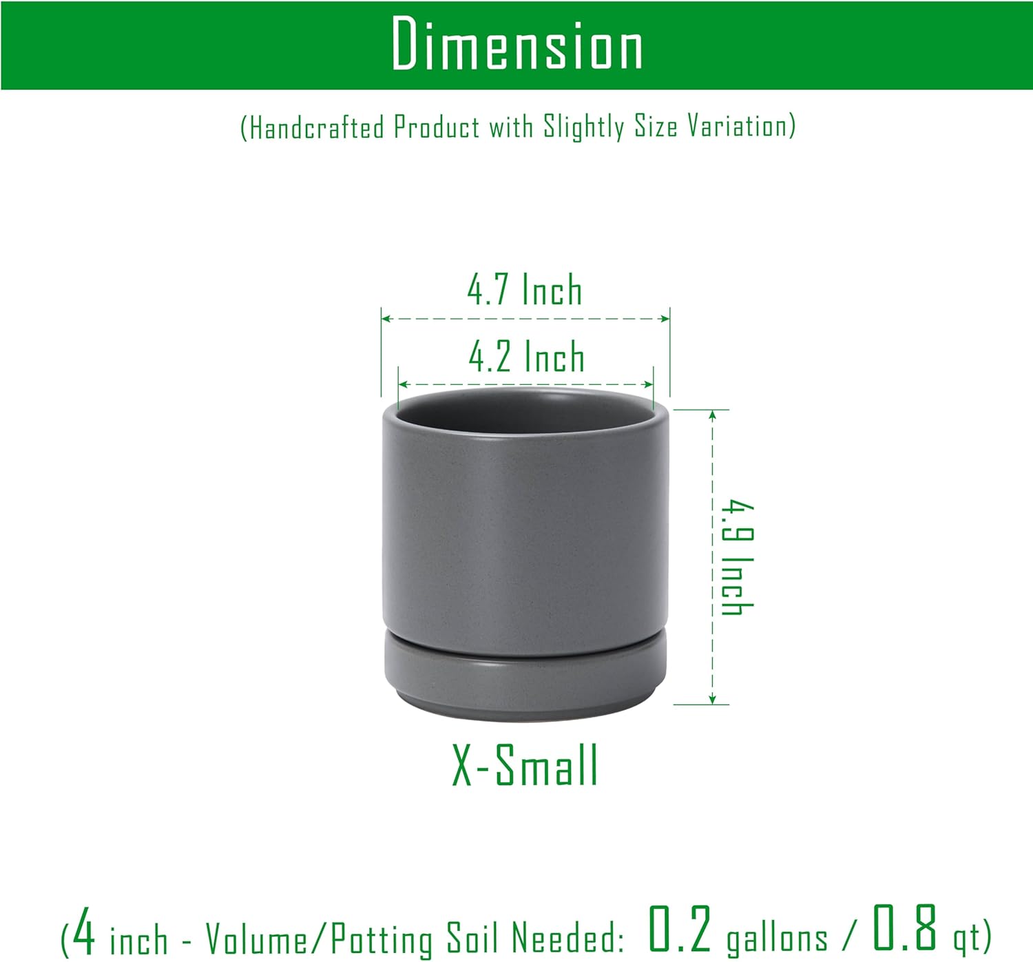 • Set of 4 Small Planter Pots - 4.7" Diameter (4.2" Inner Diameterrr) * 4.9" Height. Volume: 0.2 gallons; Potting Soil Needed 0.8 qt.