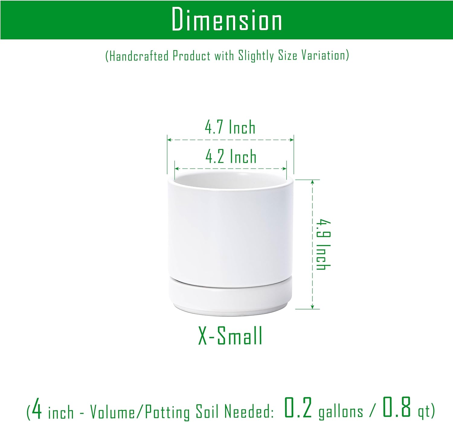• Set of 4 Small Planter Pots - 4.7" Diameter (4.2" Inner Diameterrr) * 4.9" Height. Volume: 0.2 gallons; Potting Soil Needed 0.8 qt.