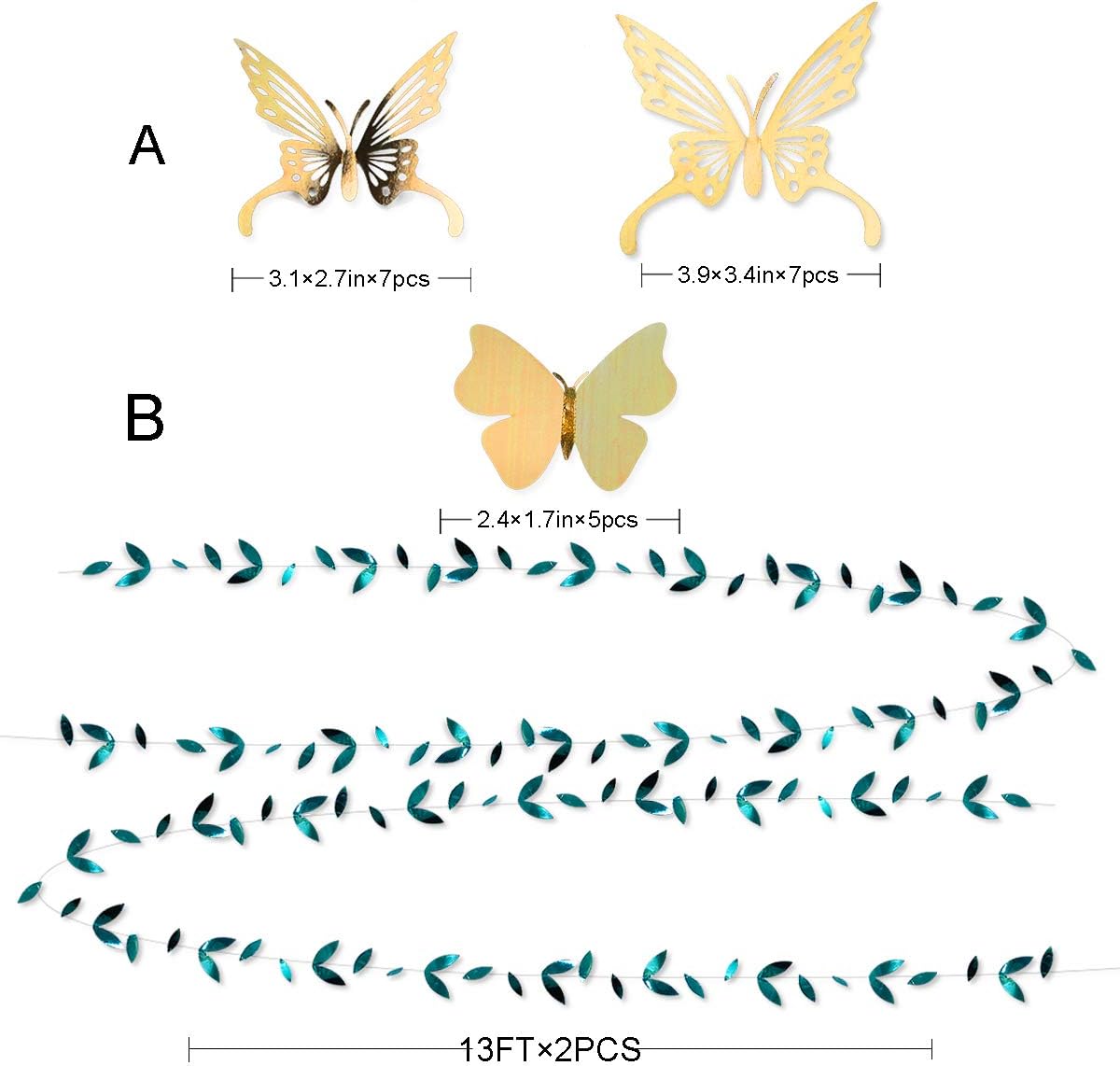 • Package Contains - 2× metallic emerald green leaves garlands,7×tissue paper flowers pom pom,4×tissue paper lanterns,24× gold butterfly decals,4×dark green ribbon.Total 41 pcs.