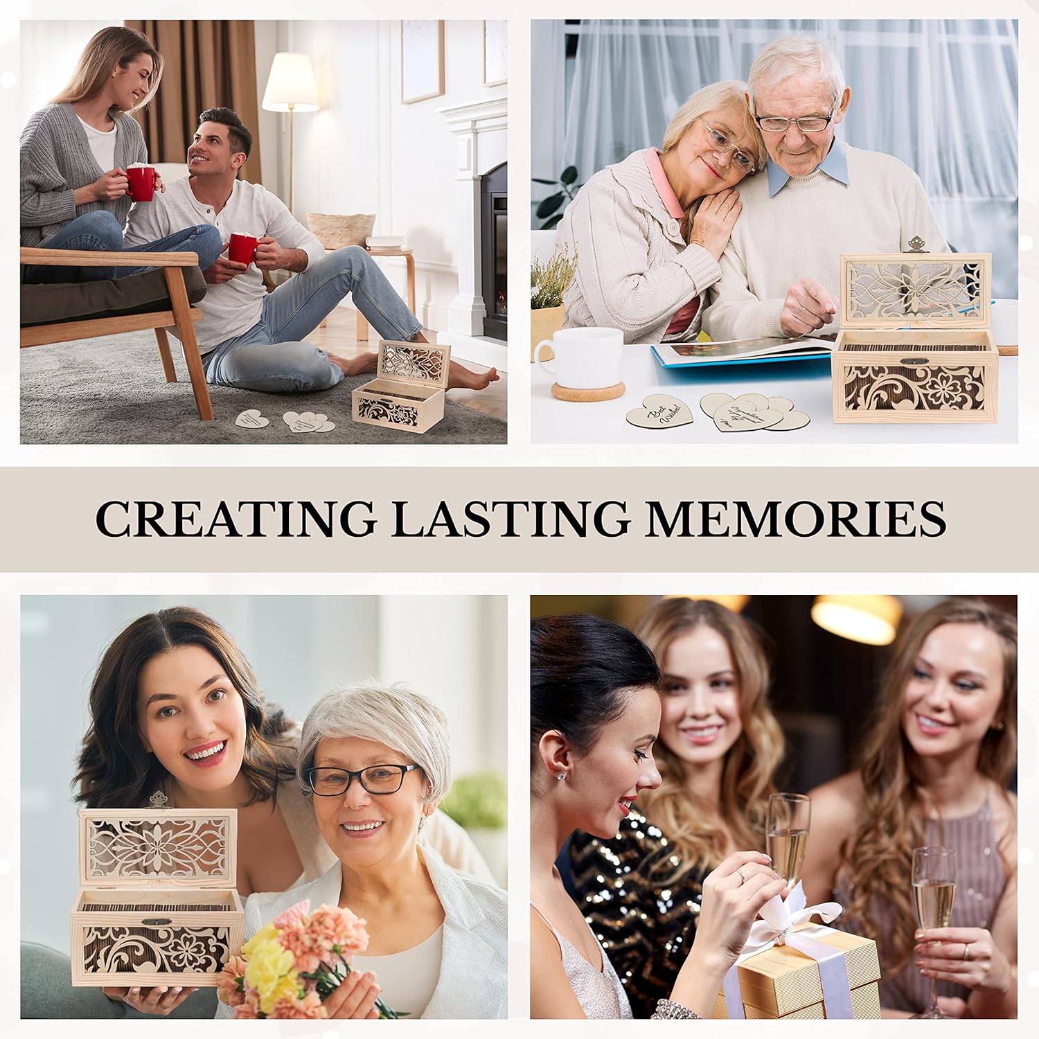 • ๐Ÿ”ธ Hand Made High Quality - Hand crafted in Vietnam. Solid Pine Wood Box 8" Length X 4" Width X 4" Depth. 62 X 3.1" large laser cut hearts for your guests to sign. Display sign: 3.5" heart + 2" block stand. A lifetime of memories.