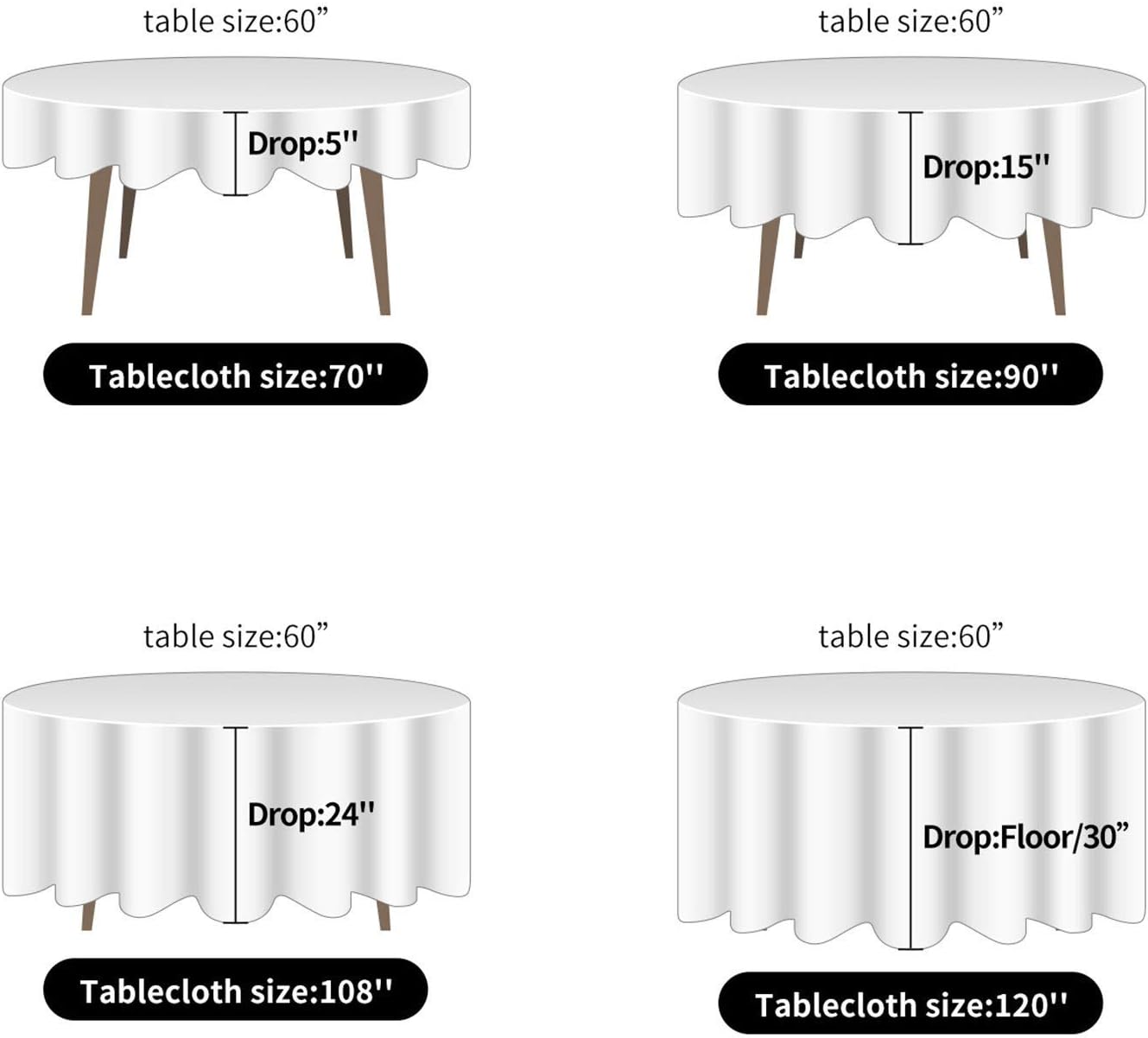 • 2 PACK SET, MORE ECONOMICAL: Each pack include 2 pcs of tablecloth, measuring 90” diameter each. Durable for repeat use, cheaper than renting.We also have 6 pack set and 12 pack set,which will save more.