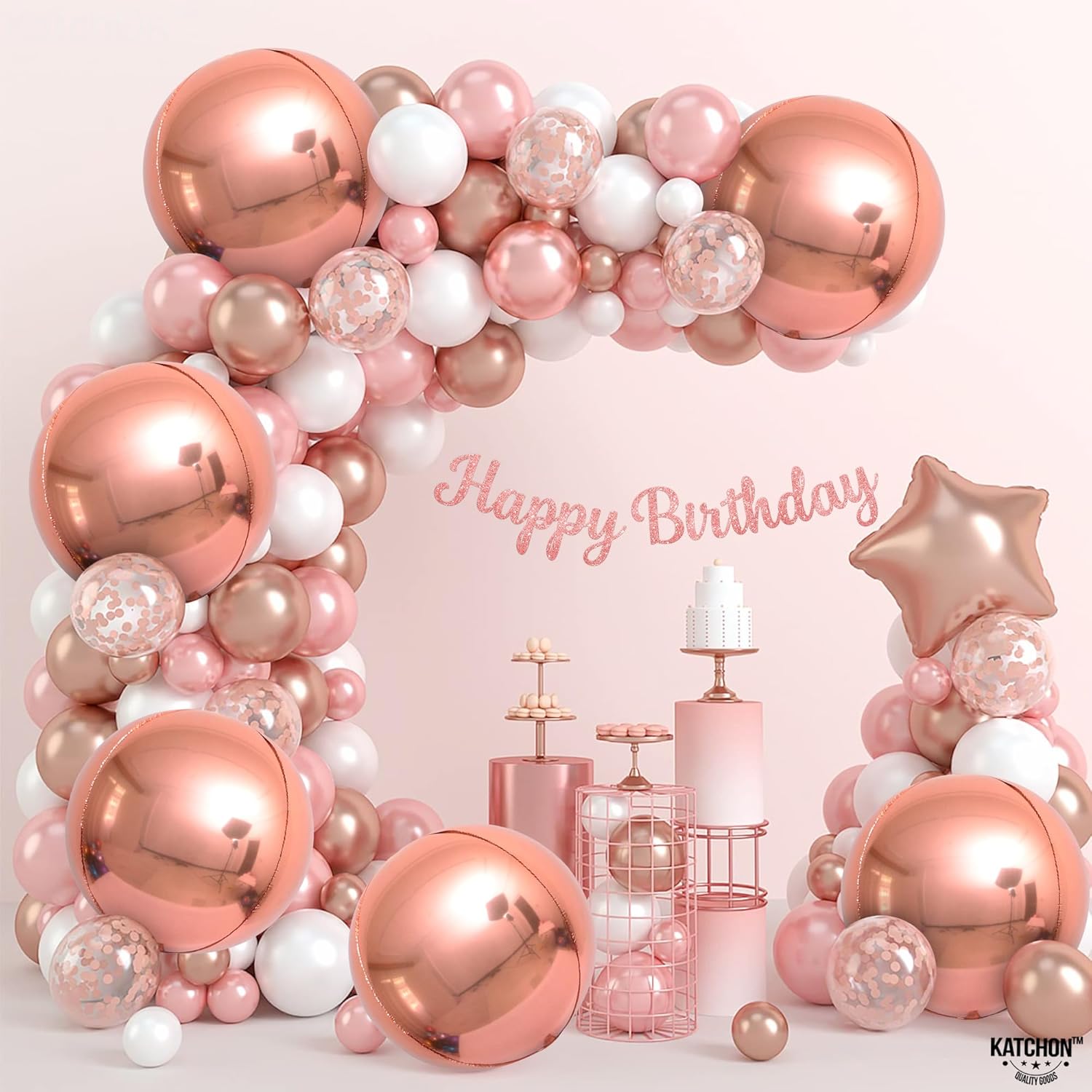 • REUSABLE | STURDY | DURABLE - Rose gold balloon arch kit with exceptional style and remarkable quality? Elegant Rose Gold big Balloons is made from Grade "A" quality aluminum foil materials. Long lasting rose gold 3 year old balloon, round mylar balloons, rose gold happy birthday balloons that could stay hanging in your walls, windows, or door for days after you install rose gold ballons. Perfect rosegold balloons for birthday, giant rose gold foil balloons for birthday, sweet 16th Birthday decorations, engagement party decorations, rose gold and black balloon garland party decorations.