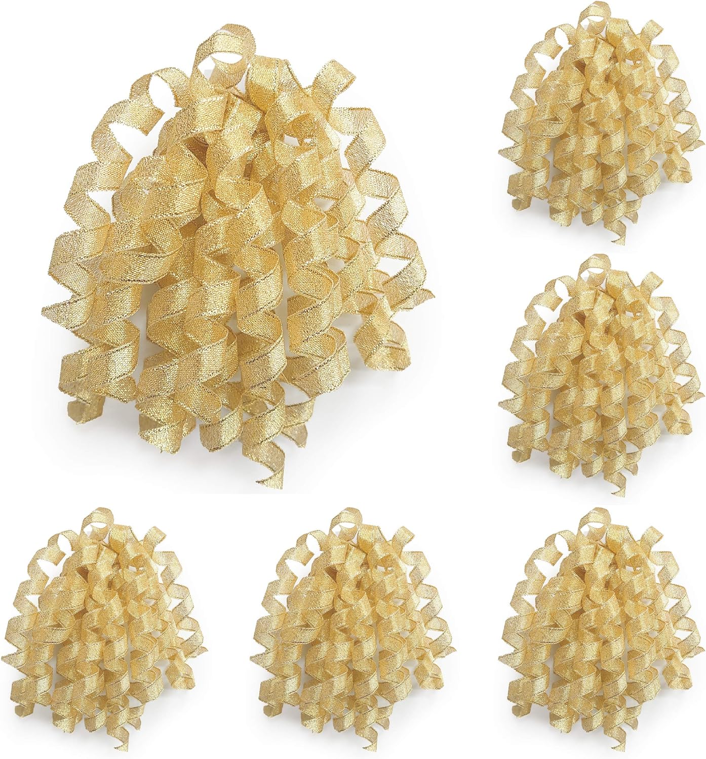 • The gold metallic Curly ribbon bow is 6" Long with self-adhesive tab and There are 6 ribbon gift bows in the package. They are made of high-quality fabric metallic ribbon material, which is durable and has great shape.