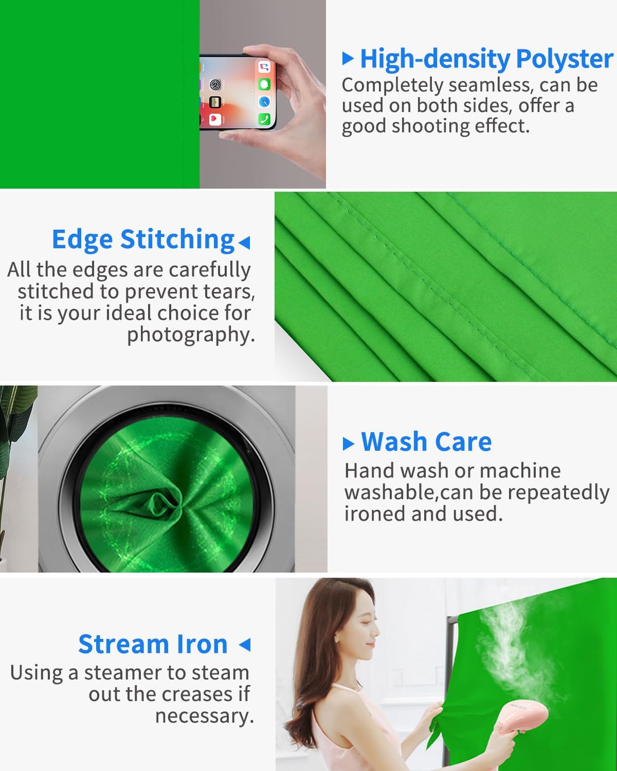 • Easy to Care:The green screen is 100% made of polyester, machine and hand washable, ironable, foldable, and all edges are carefully finished preventing tears in the material