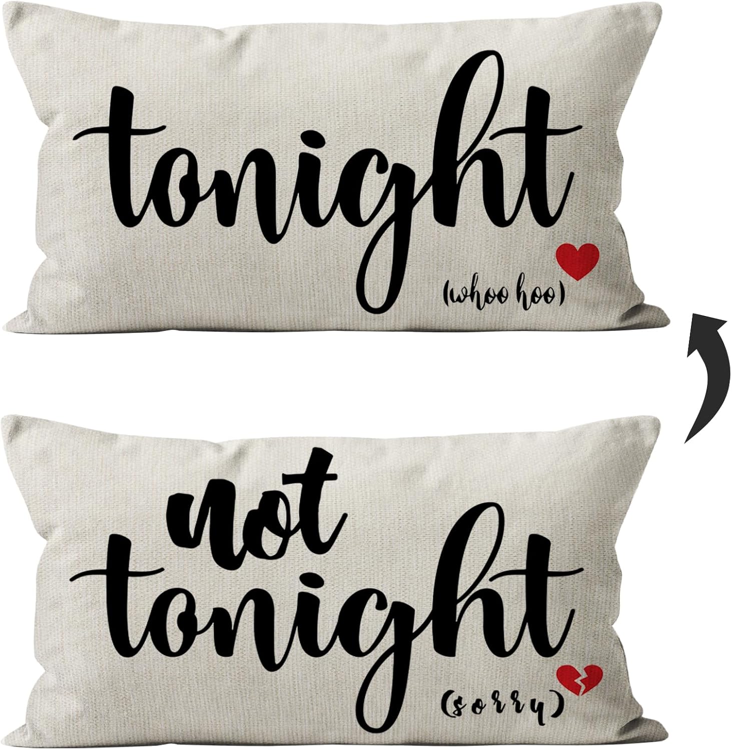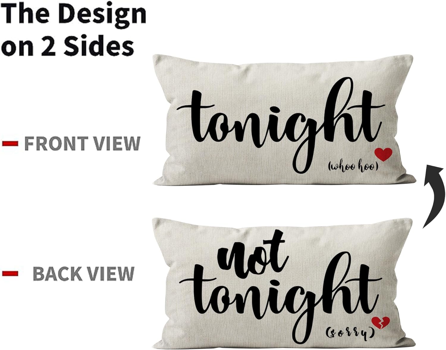 • Dual-sided Design: Enjoy the versatility of two charming patterns โ€“ "Tonight" and "Not Tonight." Playfully set the mood by flipping the pillow to match your desires, adding a touch of fun to your bedroom or sofa.