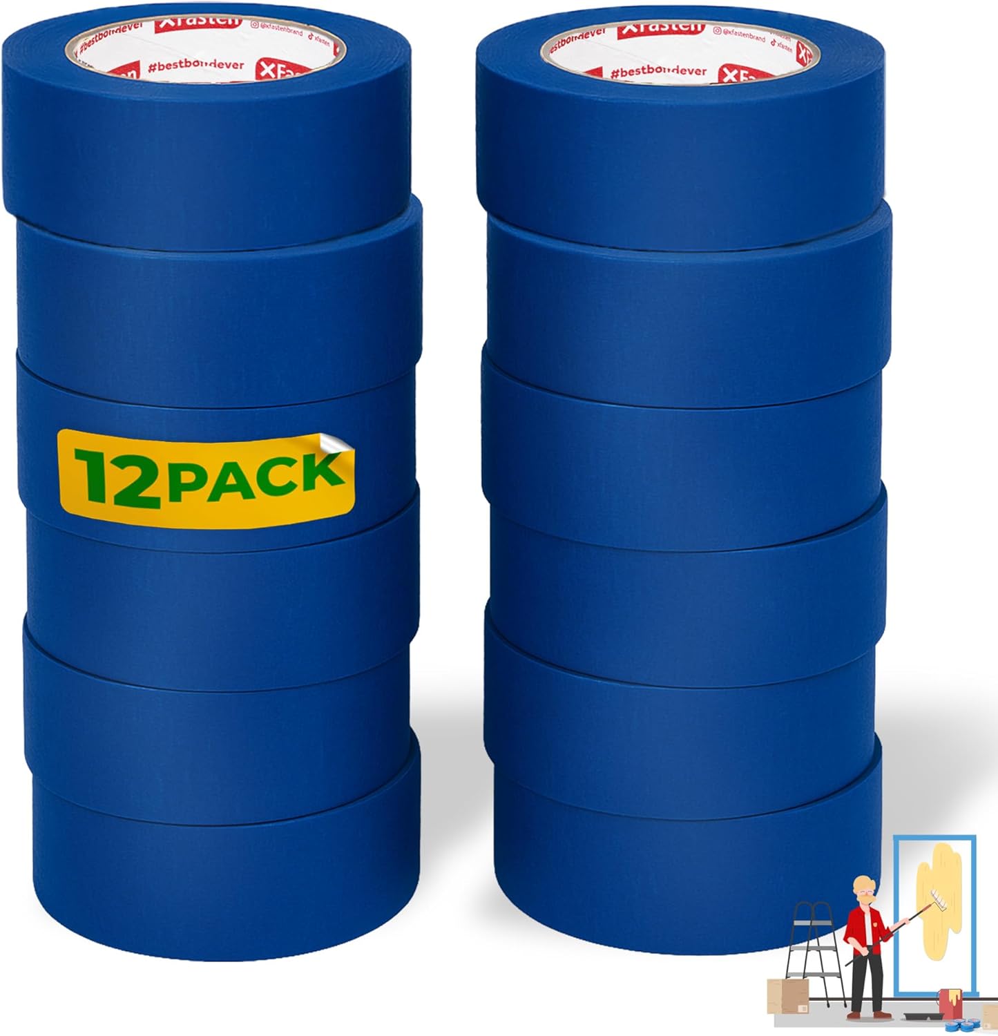 XFasten Blue Painter's Tape, 2 Inch x 60 Yards (12-Pack) Blue Painters Masking Tape Bulk - Sharp Edge Line Technology, Produces Sharp Lines | Residue-Free and Artisan Grade Wall Trim Tape