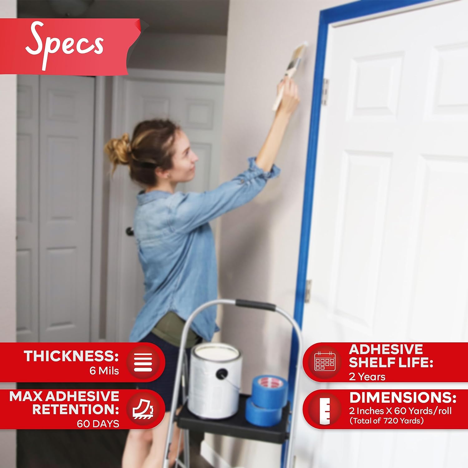 • INDUSTRIAL-GRADE Blue Painters Tape with excellent anti-bleeding width-to-width lamination that delivers sharp paint lines, narrow edges, and intricate line designs. This bulk blue painters tape 2 inch comes in a Pack of 12 rolls, which is perfect for enterprise-scale or medium to large projects for both Home renovation and automobile painting.