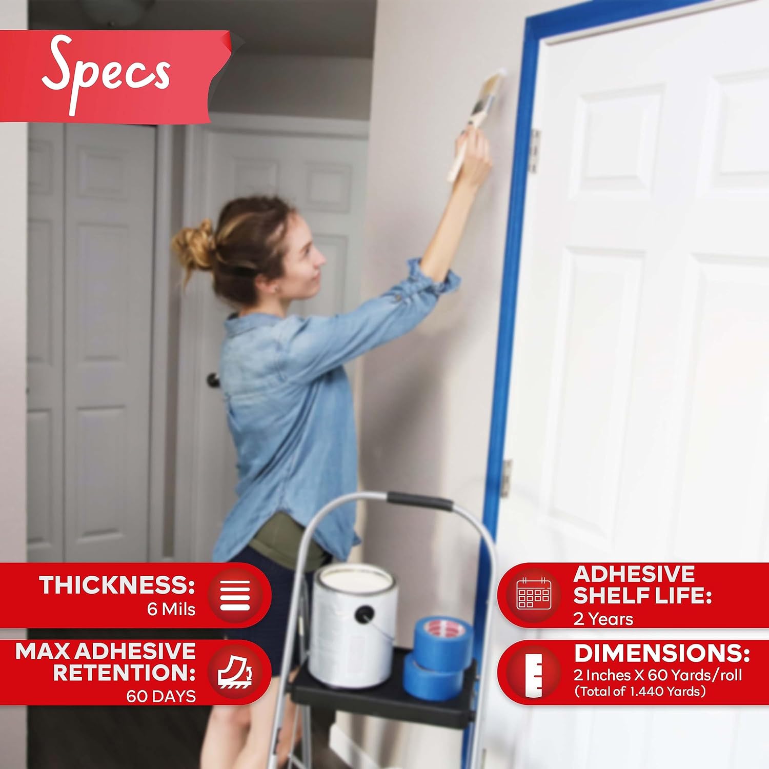 • EASY TO MANAGE, PEEL AND STICK. Our Blue Painters tape 2 inch sports an easy-release adhesive liner and pressure sensitive adhesive, allowing it to unwind from the roll easily. It will also NOT CURL UNNECESSARY IN YOUR HAND, and will only stick once you press it down, sticking only to the intended surface, EMPOWERING the AVERAGE USER with LITTLE TO NO EXPERIENCE in painting and home renovation to finally PRODUCE PROFESSIONAL-GRADE paint jobs that are at par with contractors and professionals.