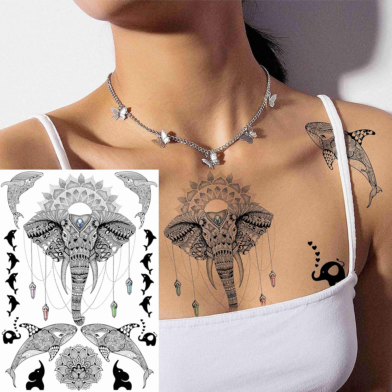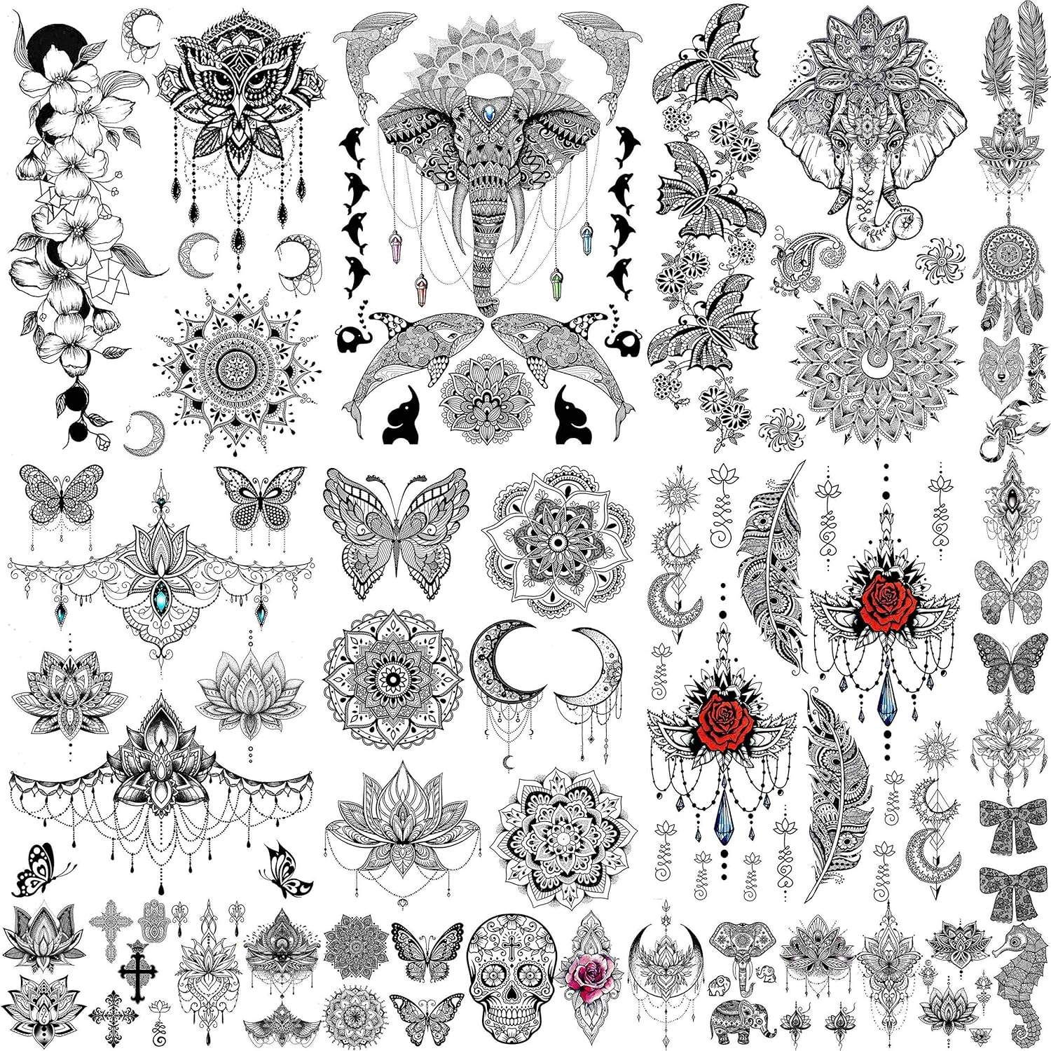 • 🍷28 Sheets Temporary Tattoos Sticker Fashion Designs🍸 EGMBGM Brand Original Tribal Elephant Owl Lord Gothic Ganesha Whale Moon Mandala Flower Feather Butterfly Rose Lotus Fake Jewelry Jewels Flower Floral Bracelets Crown Chains Dolphin Pendants Designs Temporary Tattoos For Adults. There Are 6 Sheets Large Temporary Tattoos In Each Package Of Big Size 21x15cm 8.2"X5.9" and 22 Sheets 10x6CM 4.1"x2.3" Small Temporary Tattoos For Women Kids Daughters Son Children.