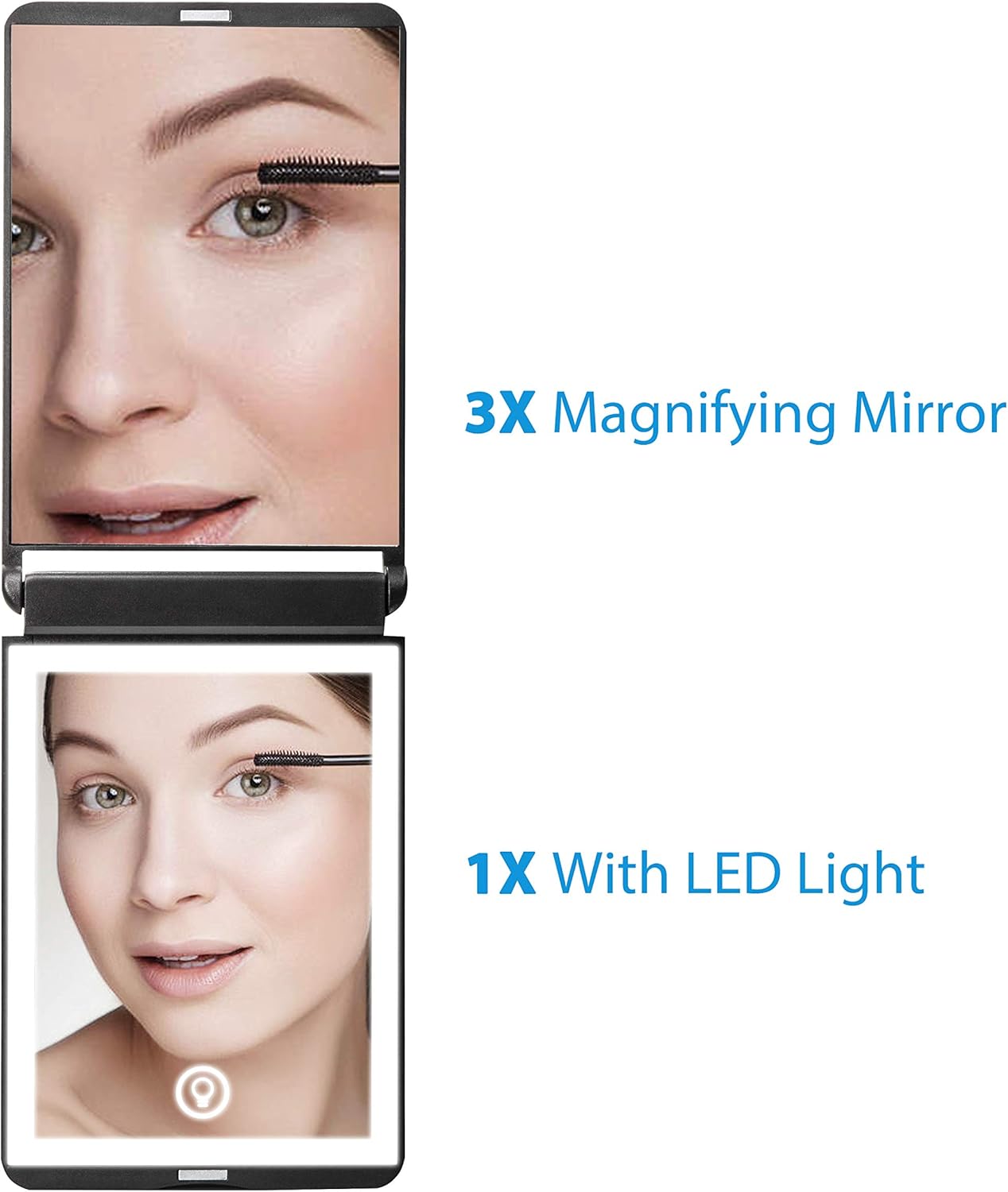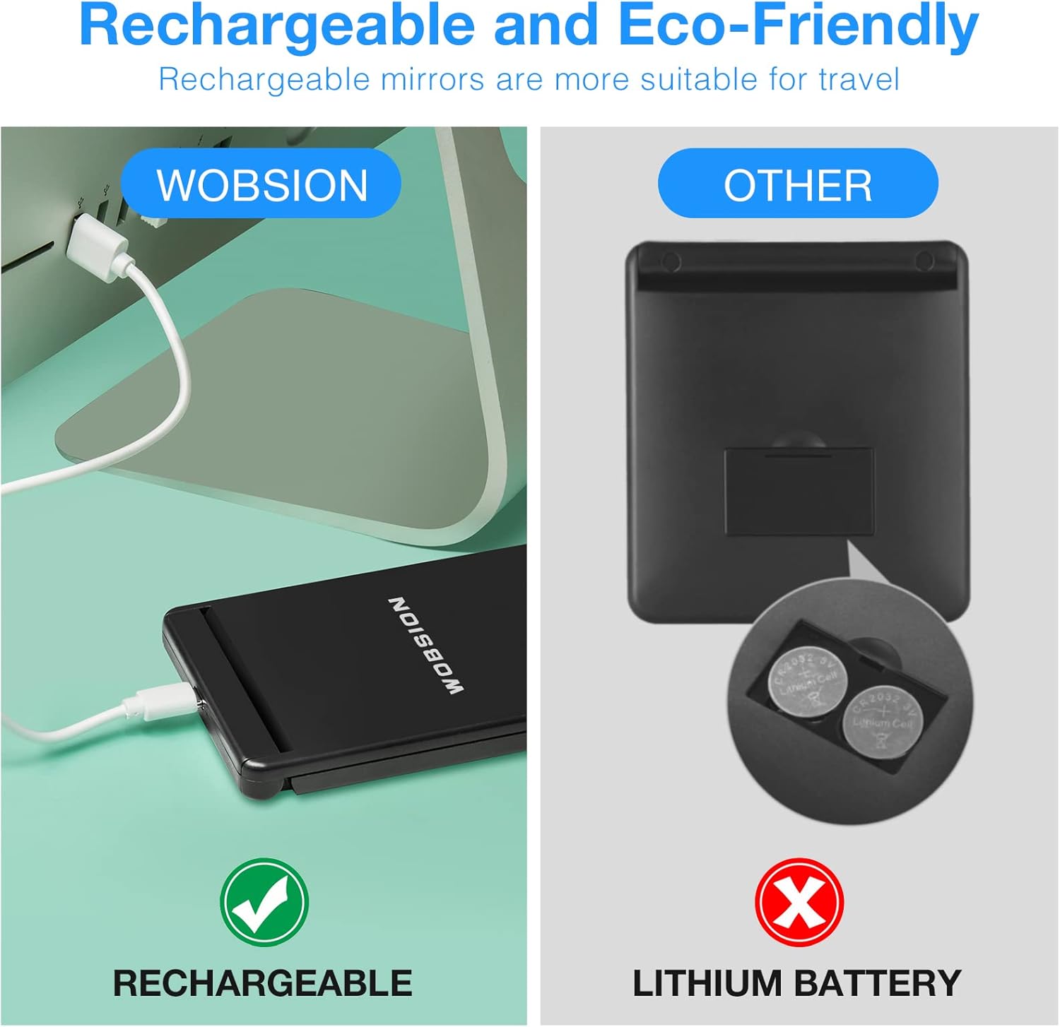 • Recharable Compact Mirror:No need batterys,long lasting,one charge can last for 4-5 hours,only takes 1-2 hours to fully charge.Rechargeable models are more travel-friendly than battery-powered ones