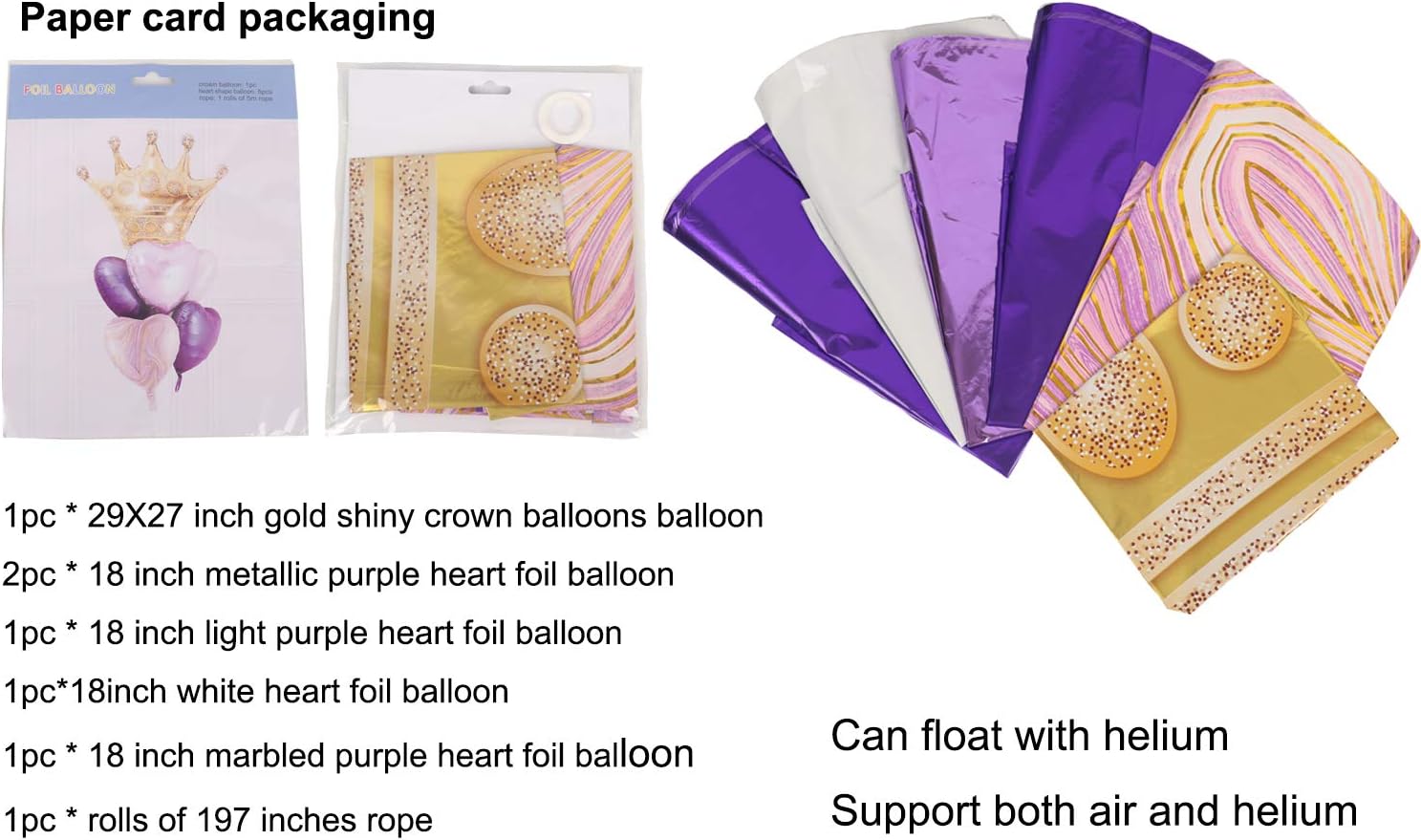 • ♥Good collocation:Our balloons include 1pcs 29*27 inch big golden crown balloons,1pcs 18inch agate marbled purple love balloons,2pcs light purple heart balloons,2pcs 18inch metallic purple balloon.