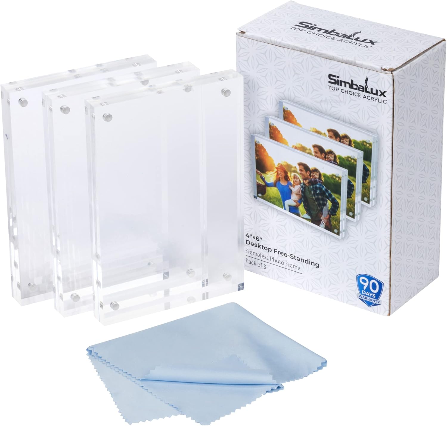 SimbaLux Magnetic Acrylic Picture Photo Frame 4x6 inches (3 Pack), Clear Glass Like, Double Sided Frameless Desktop Floating Display, Free Standing, Easy to Change