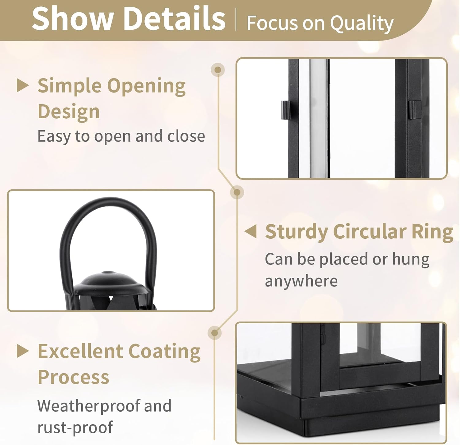 • HANGING & SITTING: Our lantern comes with a sturdy metal ring for easy hanging; also its flat base allow it sit on a flat surface. Serves as lighting and decoration for yard, wall, pathway, driveway, shelf, table, bars, photo booths, patio, porch, etc.