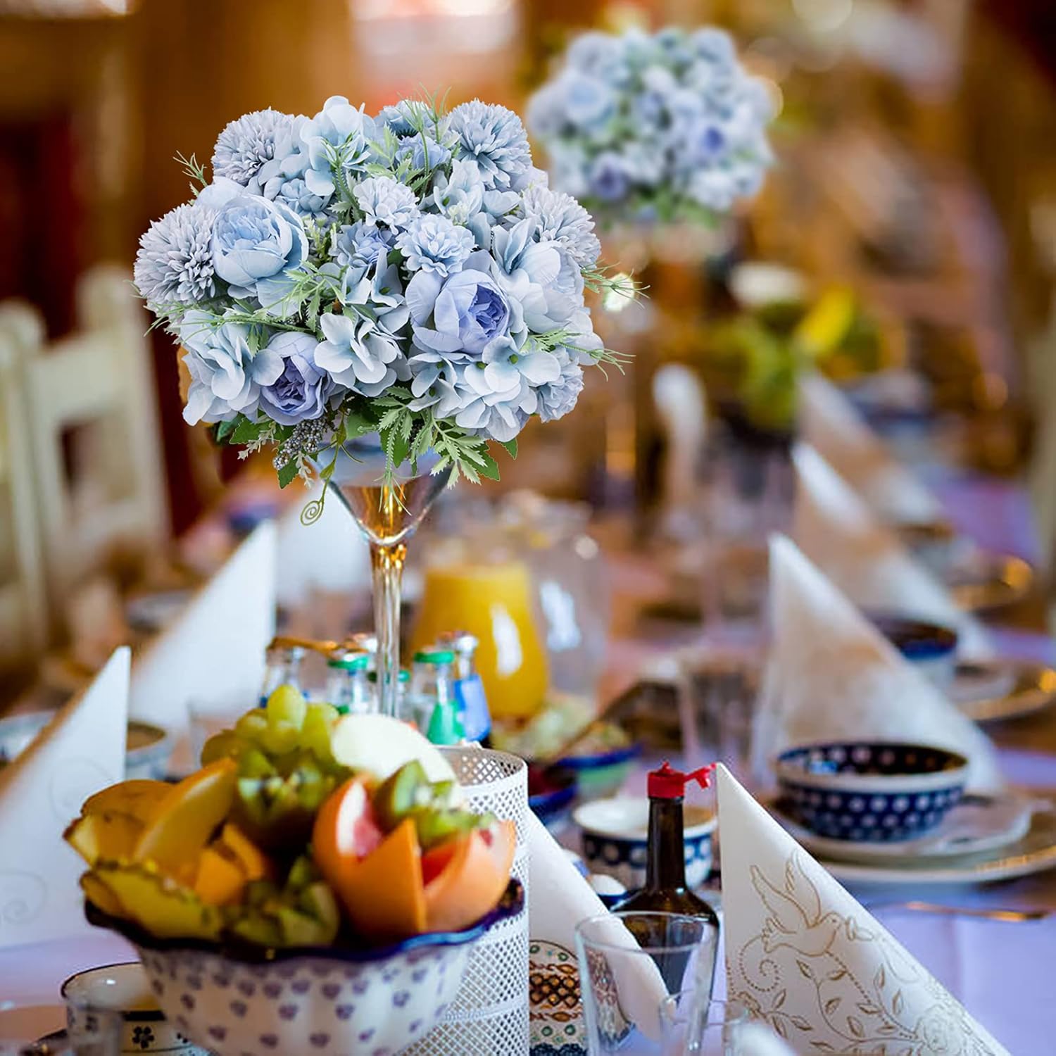 • 【What DoYou Get】 You will get 4 piece of blue realistic fake flowers. Each bunch has 7 stems with silk soft hydrangea, peonies, carnations, several flower bubbles, plastic grass and bushy leaves (vase not included).