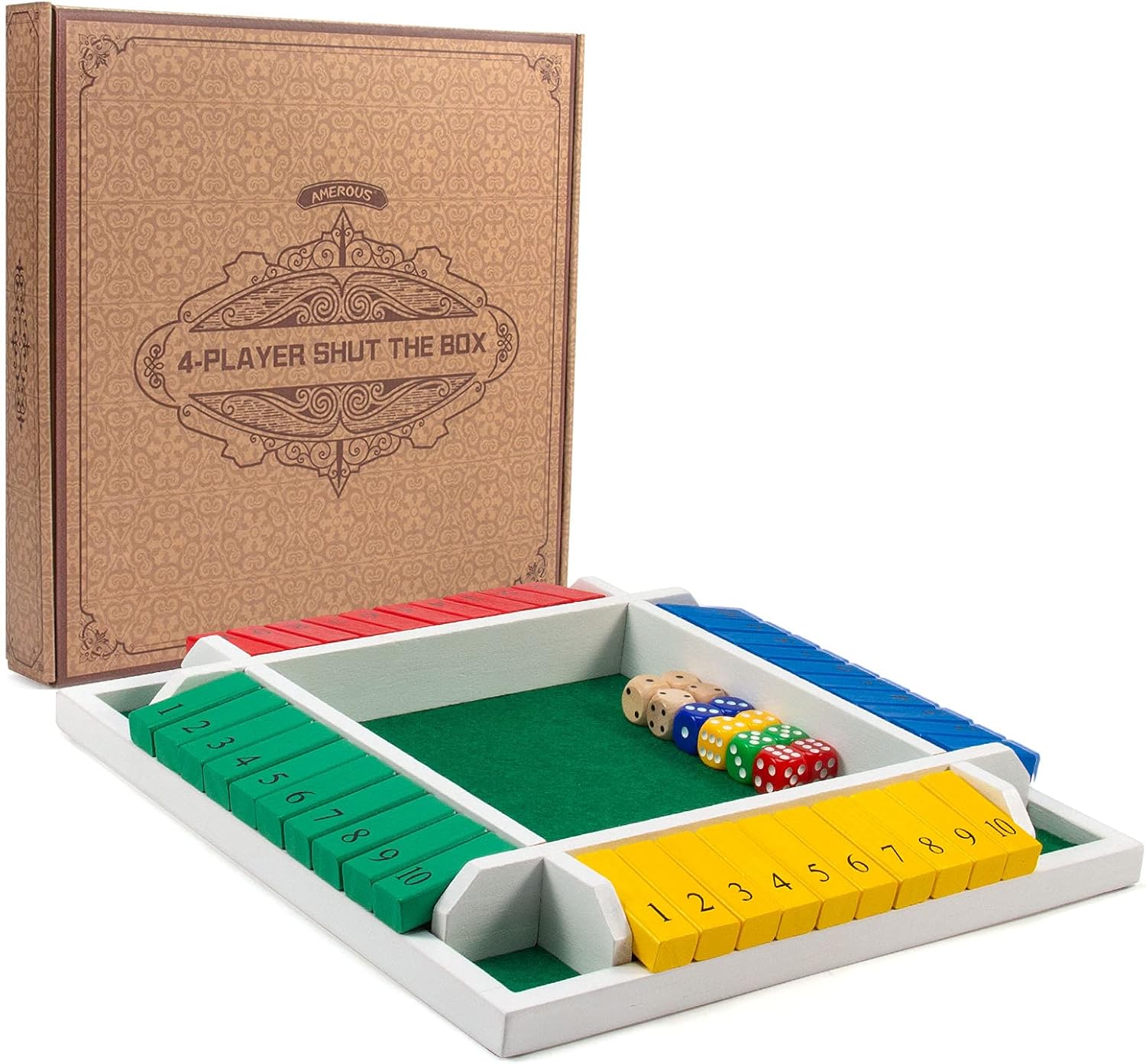 AMEROUS Shut The Box Dice Game-12 inches-Colorful Design-1-4 Players-12 Dice-Gift Package, Classic 4 Sided Wooden Board Game for Adults Kids, Classics Board Game