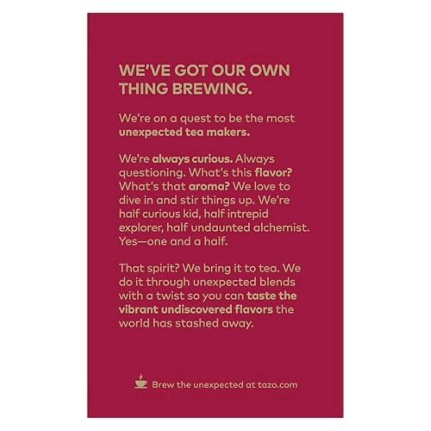 • TRUSTED COMPANY: TAZO Teas are produced without genetic engineering, meeting the Non-GMO Project Standard. Ingredients are expertly sourced giving a taste for you to savor
