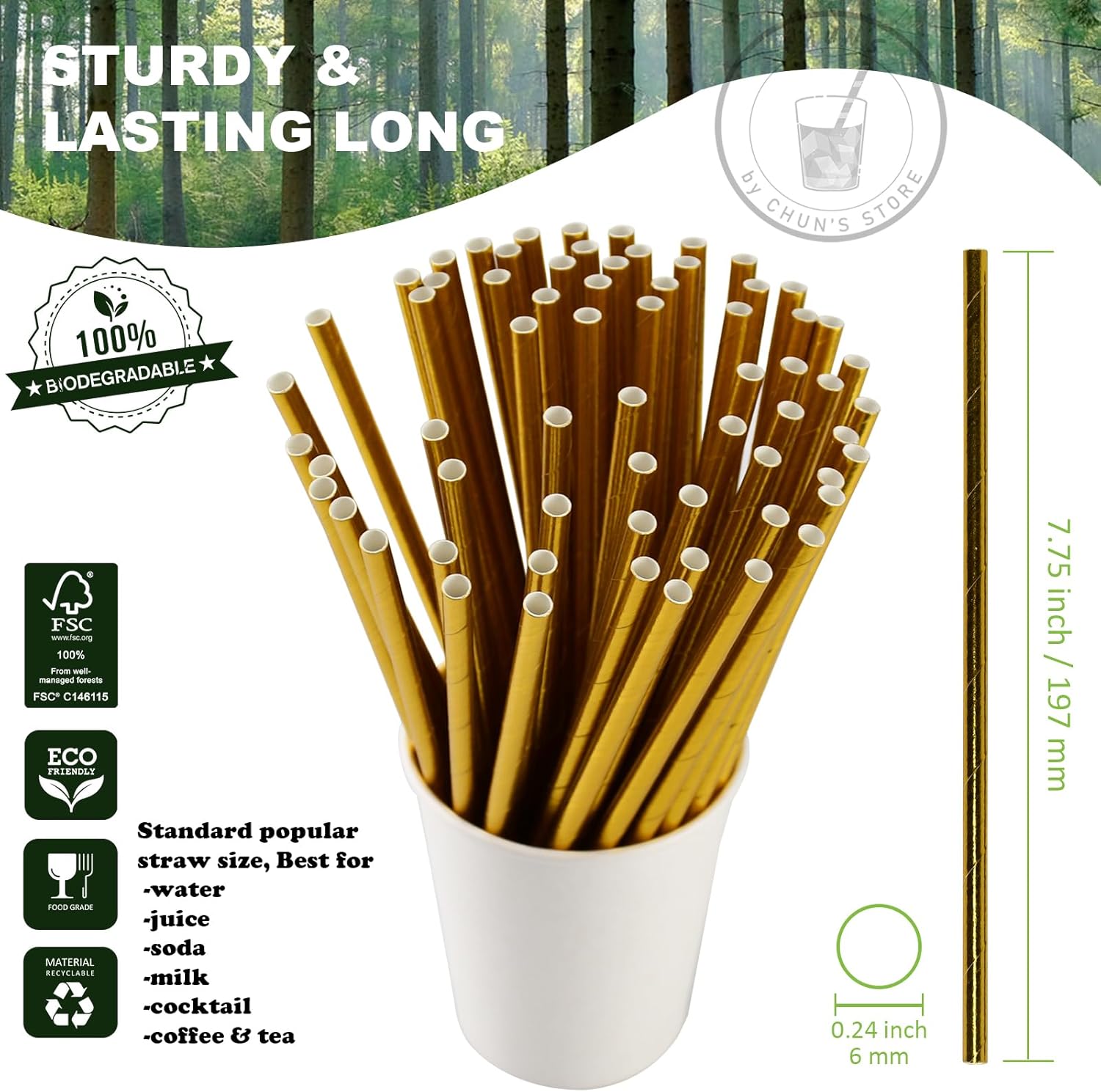 • Made from food grade paper, glue and ink. The paper of our straws are made from wood pulp originated from well-managed forest (FSC No.C146115).