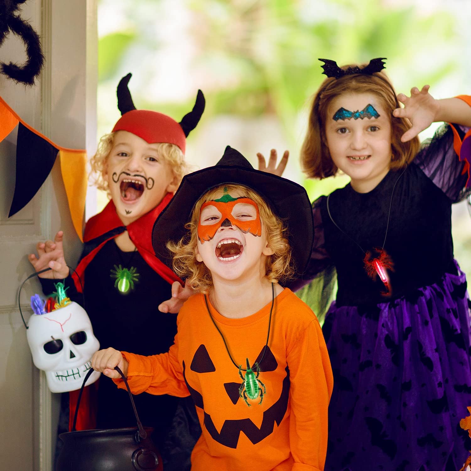 • Every light up plastic bug would be created to be a Halloween spooky necklace by using the hanging strings. You could wear them for a backyard hunt and late night hunt.You could hang it to goody bag , Jack-o'-lantern, Halloween buckets or any other decoration to embellish your Halloween party. Have fun with your party favors glow critters!