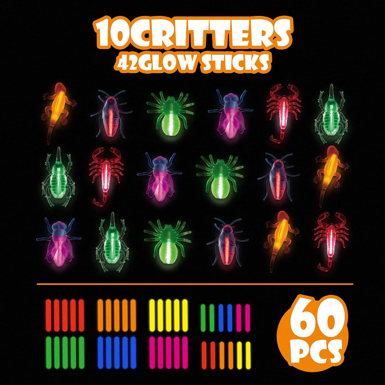 • Glow in the Dark Halloween party favors-There are 18pcs glow gritters in our glow in the dark party set ,6 different kinds,3pcs for each kind.42 glow sticks in 6 colors for the Critters.Also come with 18 bonus decoration strings.Easy to Active. Fun and safety. Glows for Hours.Replaceable Glow Sticks.