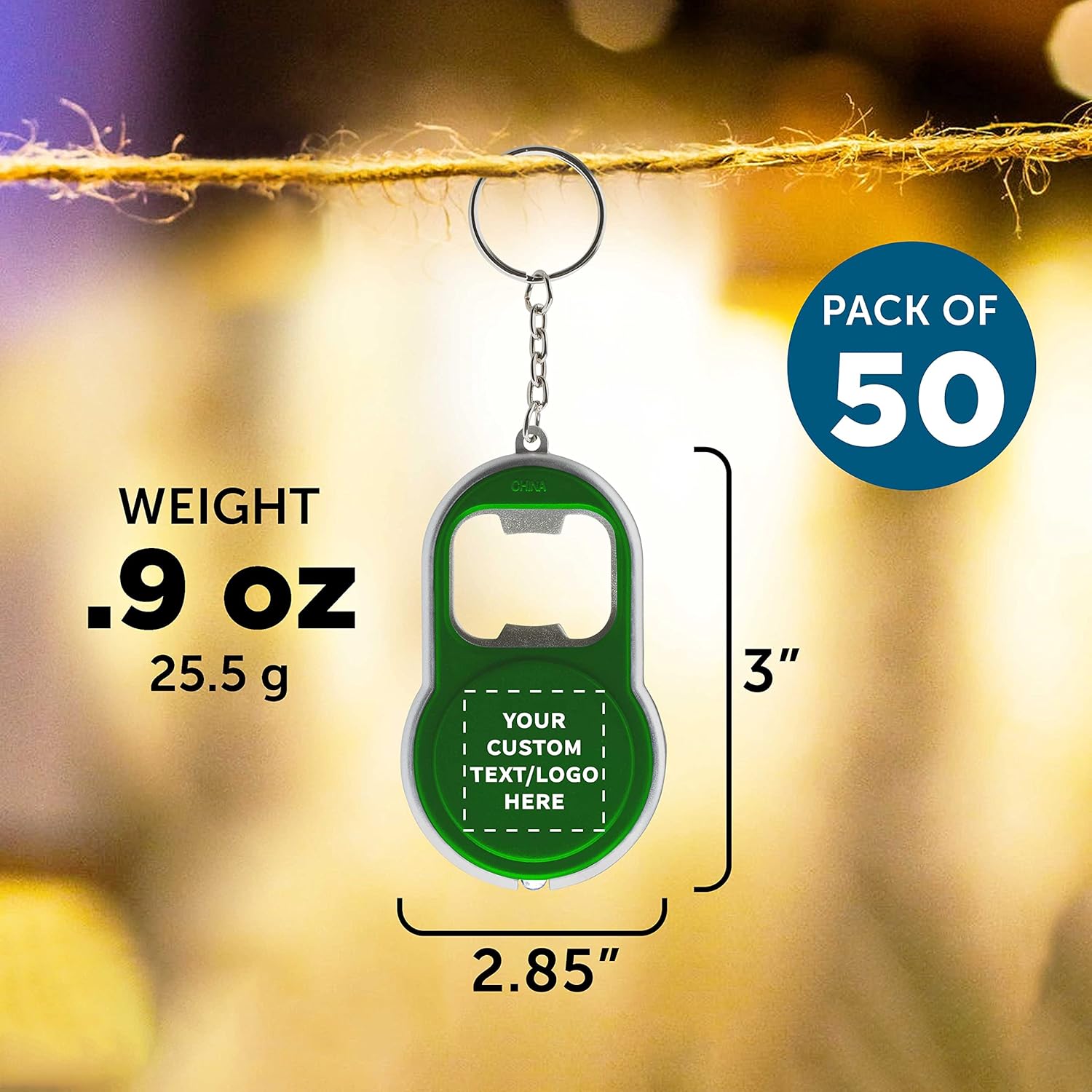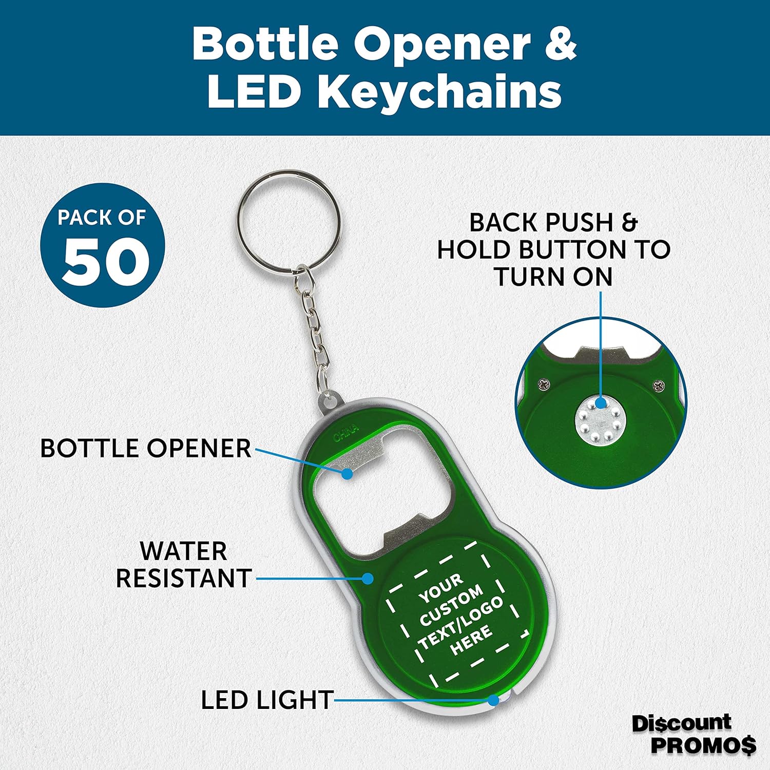 DISCOUNT PROMOS Custom Bottle Opener & LED Keychains Set of 50, Personalized Bulk Pack - Perfect for Tradeshows, Party Favors, Other Events - Green