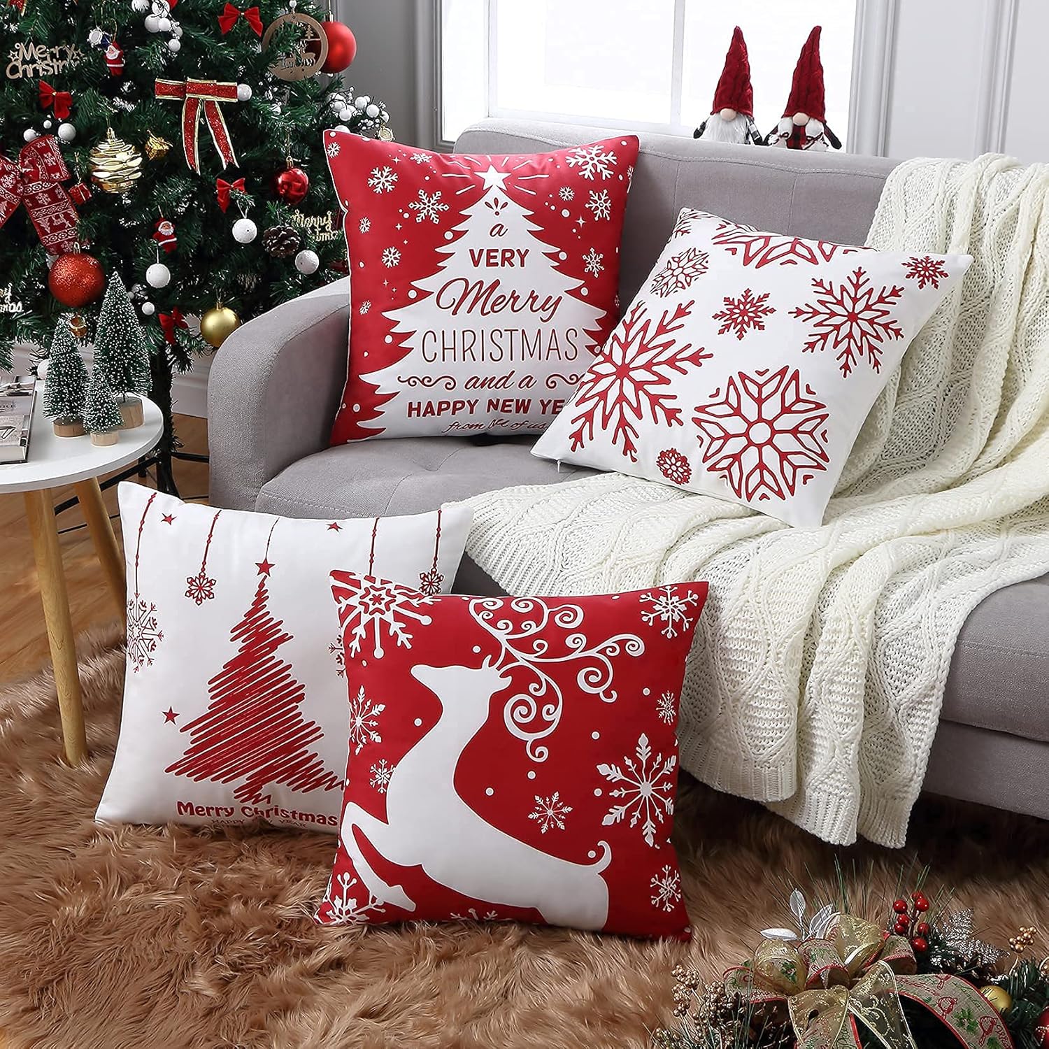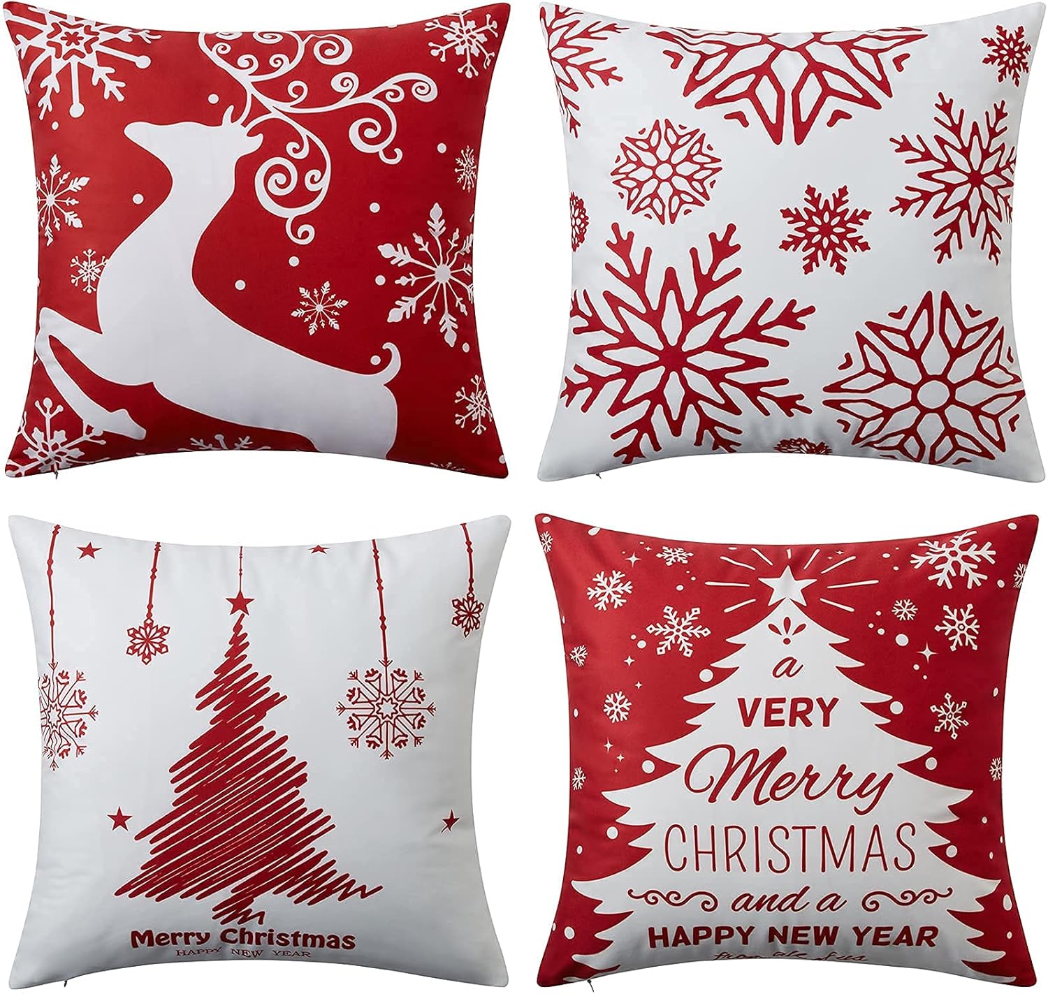 • ☃【CHRISTMAS DECORATIONS】 The Set of 4 Red Xmas Decorative Pillow Covers are designed with full of Christmas elements, such as Reindeer, Snowflake, Xmas Trees, "Merry Christmas", "Happy New Year" and etc, rendering a strong Christmas festival atmosphere.