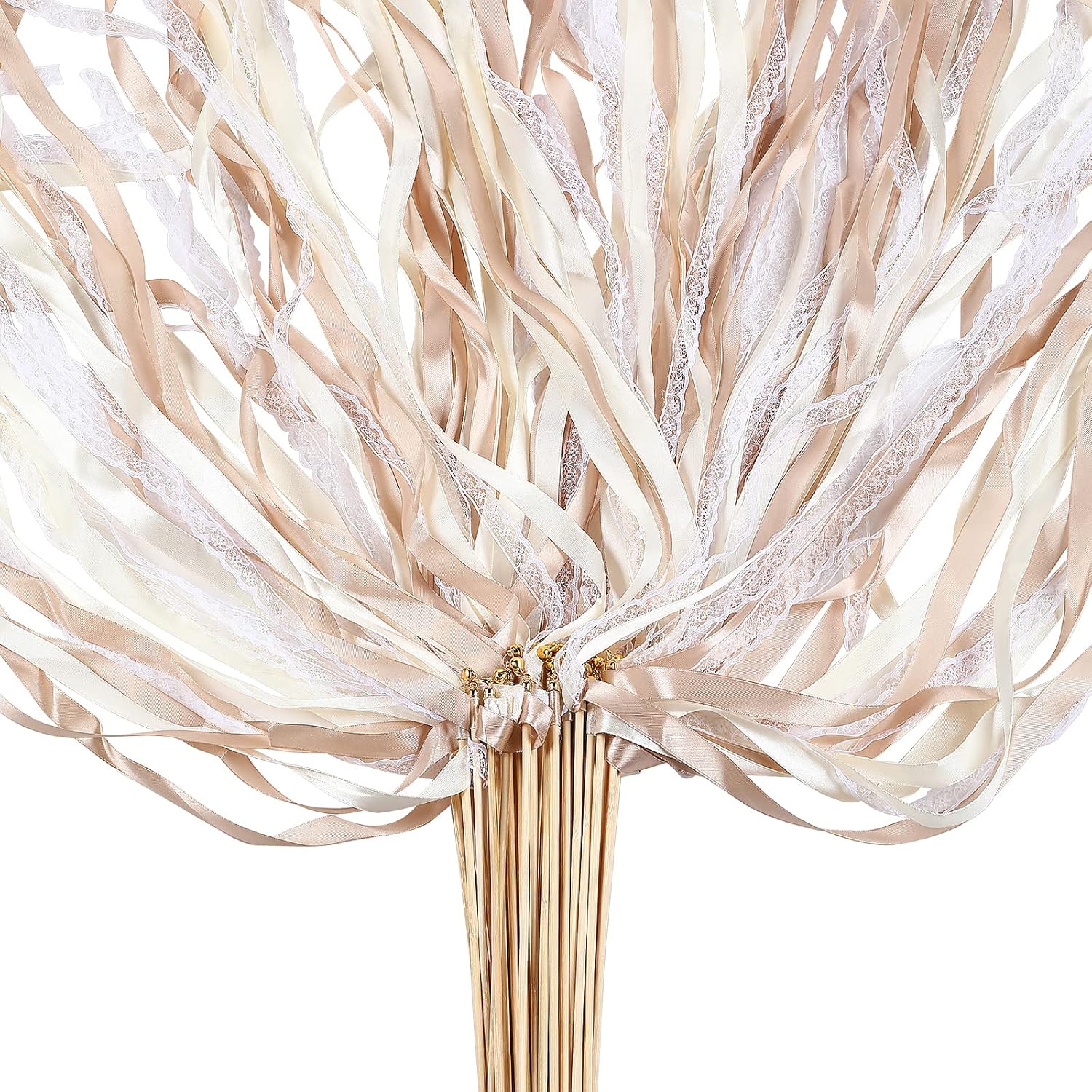 Sumind 40 Pieces Ribbon Wedding Streamers with Bells, Lace Fairy Wand Stick Party Ribbon Streamers Chromatic Silk Streamers for Party, Birthday and Holiday (Champagne)