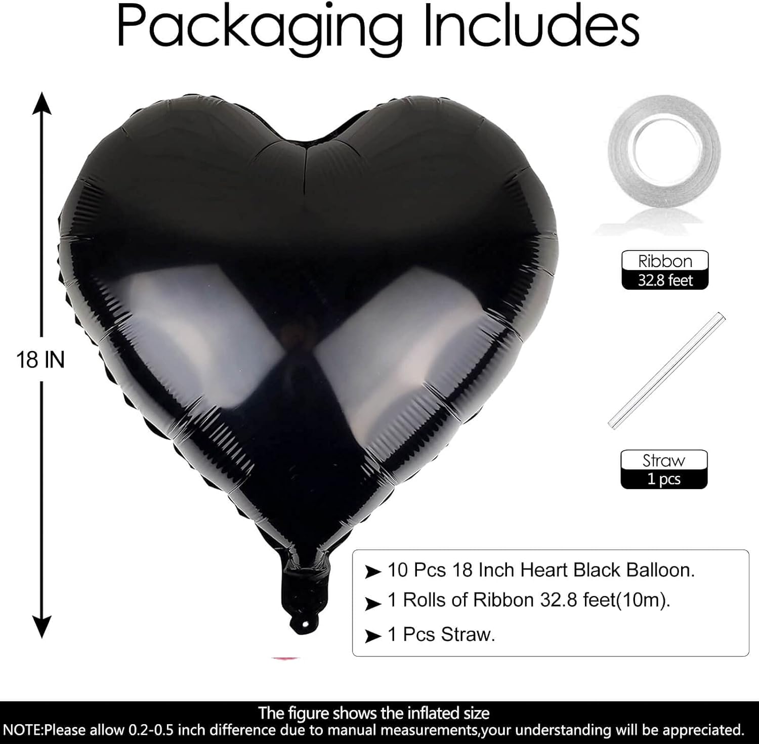 • Package Included:10Pcs 18 inch Black Heart Balloons (uninflated) + 1pcs Straw +1pcs 32 foot Ribbon Roll