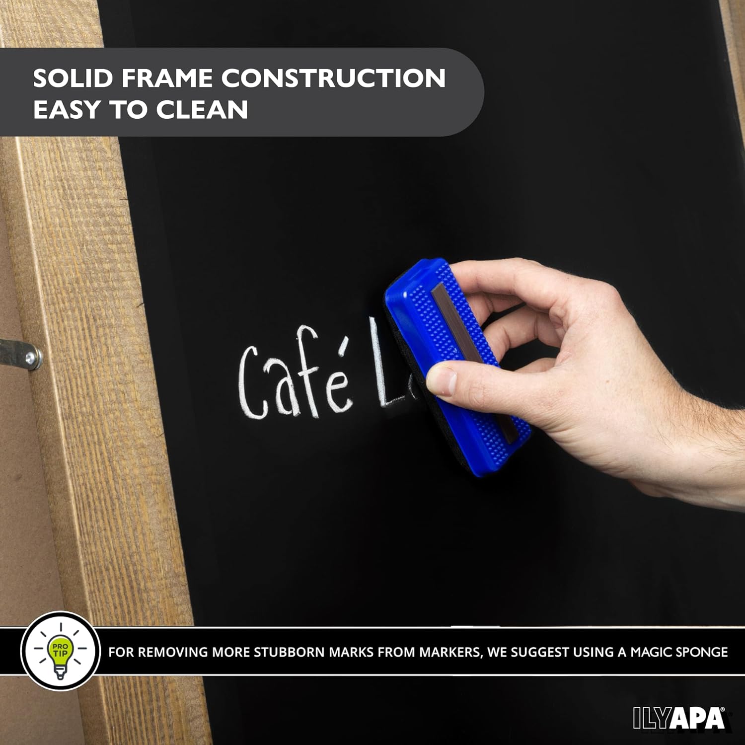 • Double Sided: This sandwich board has ample space for ads, deals, jokes, menus, and more. Captures attention, highlights messages. This chalk sign is perfect for Restaurant, Business or Weddings, and any other event.