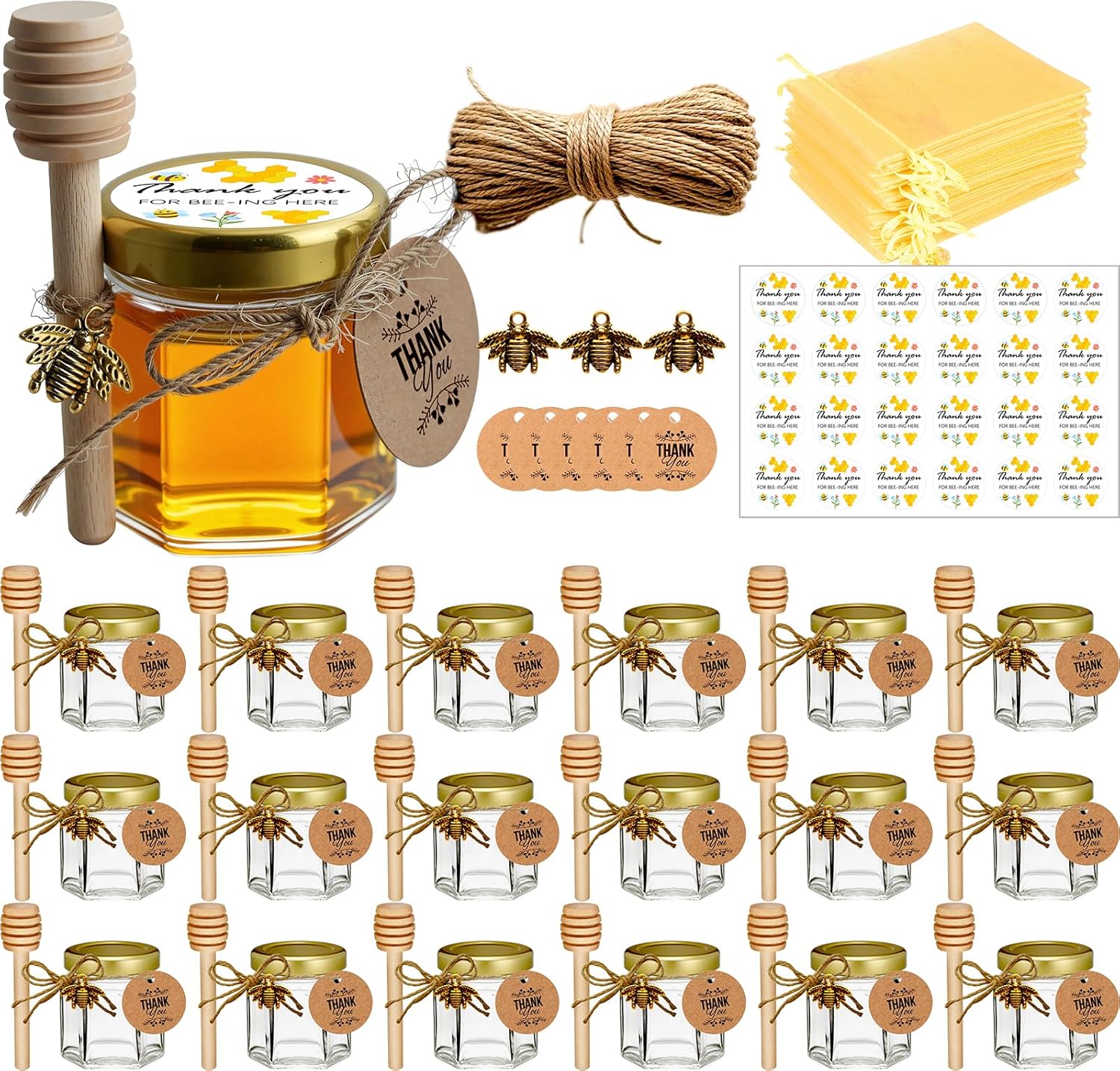 • What You Will Get - Our 1.5oz glass honey pot is come with Bee-Themed Accessories, including 20 pcs glass honey jars and wood dippers, 20 pcs gold lids, 12m jutes, 20 pcs bee charms, 20 pcs gold gift bags and 20 pcs thank-you tags