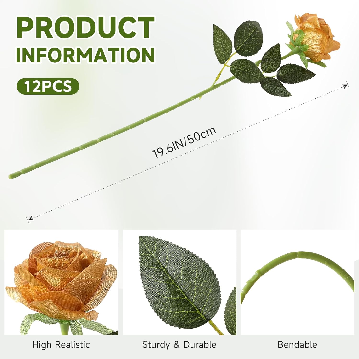 Tifuly Gold Roses Artificial Flowers -12Pcs Realistic Single Long Stem Fake Silk Roses Bouquet for Party Home Wedding Centerpiece Hotel Office Decor
