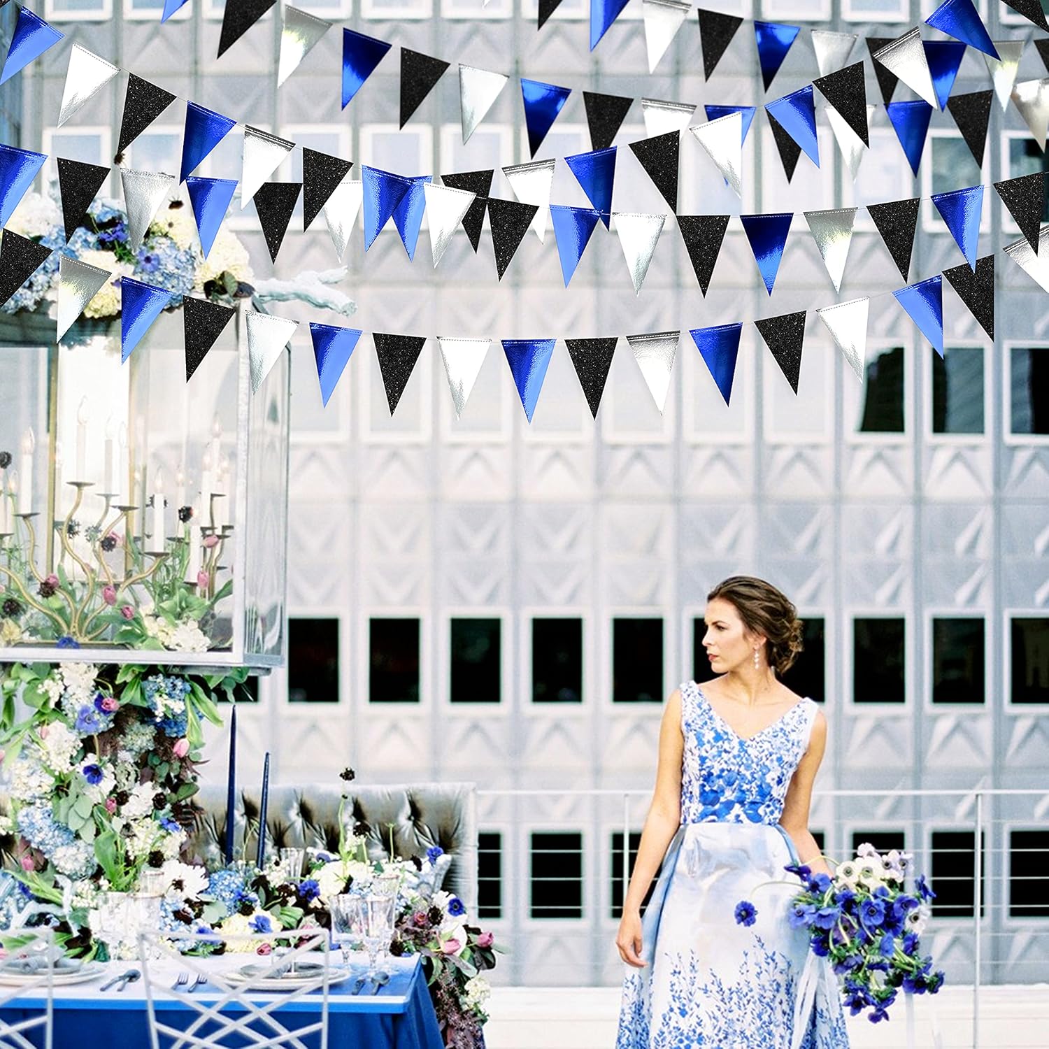 • đź’™PACKAGE CONTAINS- 3 set of royal blue black silver hanging triangle party banner,each string is 3 meters with 26 pieces triangular flags,so total is 9 meters = 30 feet and 78 pieces flags. Size of each flag:14cm x 9cm/5.5" x 3.5" (L x W).