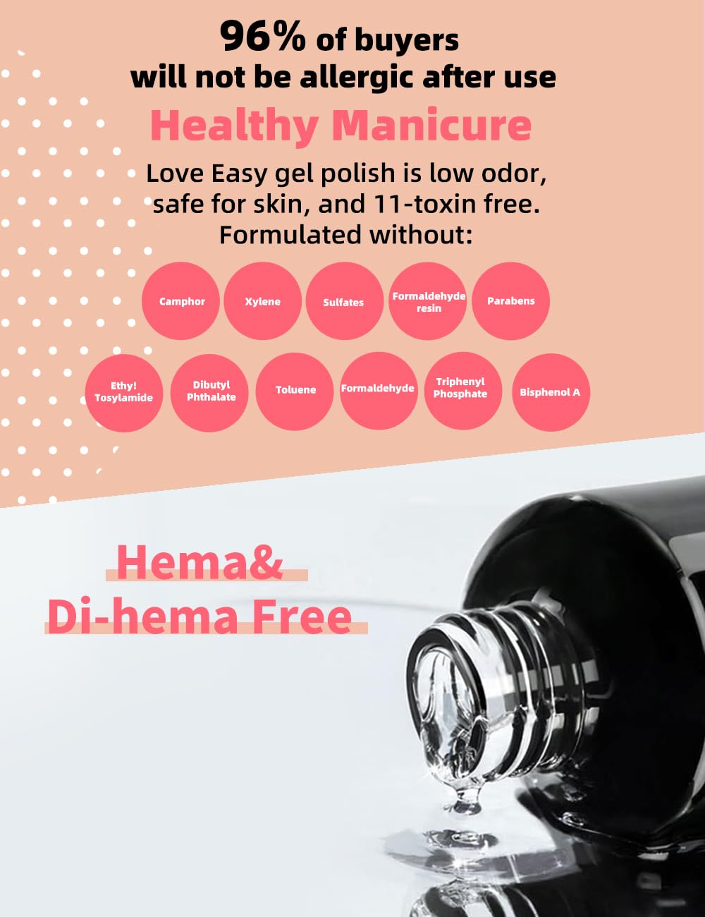 • Tips for preventing nail surface peeling off: (1) Polishing of the nail surface: Polish the front, side and trailing edge of the nail until there are no reflective spots on the nail surface. (2) Nail surface cleaning: It is recommended to use Nail dehydrator to remove oil and moisture from the nail surface. (3) UV/LED lamp time: It is recommended that the lighting time for base Coat, Color Gel and Top Coat 60-120 seconds.