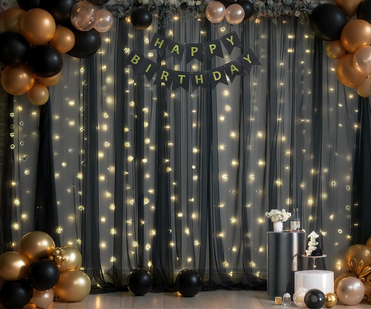 • Products include: 10ft×8ft black sheer tulle backdrop curtain, a set of 9.8ft warm white string light and 12pcs Transparent clips (no remote control).