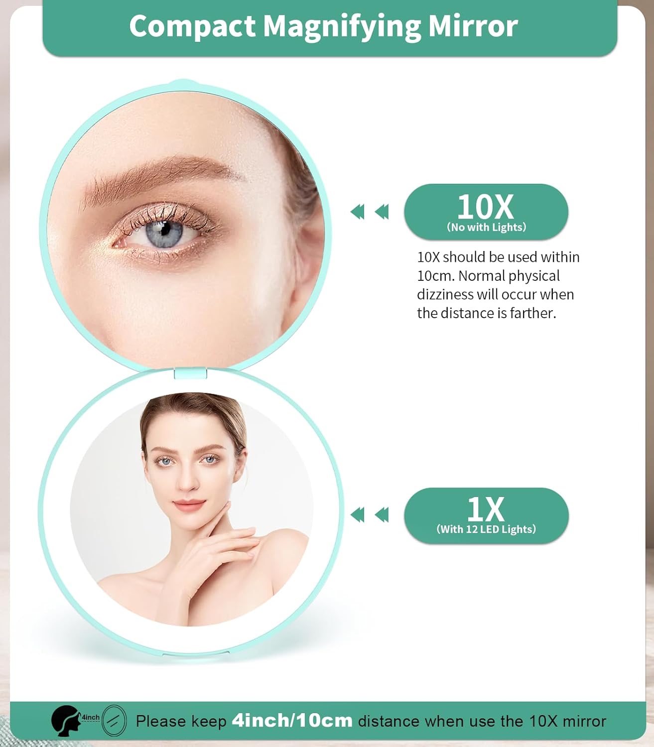 • 10x Magnifying:10x compact magnifying mirror, better magnification of facial details,which is good for makeup needs, shaving, or deep cleaning.Tip: When using the 10x magnifying mirror, please keep a distance of less than 10 cm, otherwise it may cause normal dizziness and affect imaging