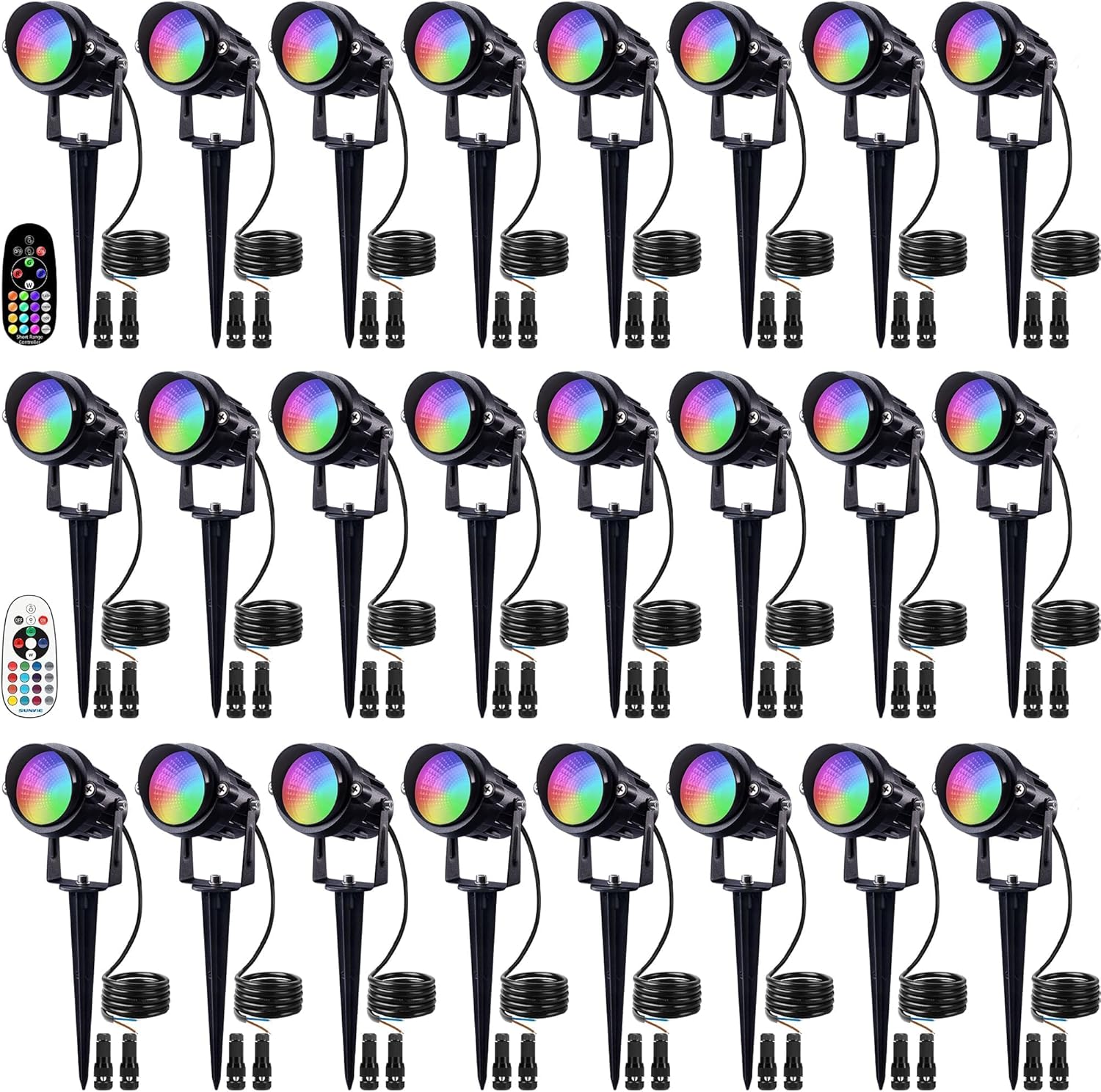 • 【RGB Landscape Lights with RF Remote Control】 24 pack 12W RGB low voltage landscape spotlights with die-cast aluminum casing and metal stakes. Including 2 remote controls, 1 with a control range of 19in for individually controlling each light. Another control range is 50ft for controlling multiple lights simultaneously. Perfectly decorate your court yard, tree, house, fence, Wedding, Christmas, Halloween.