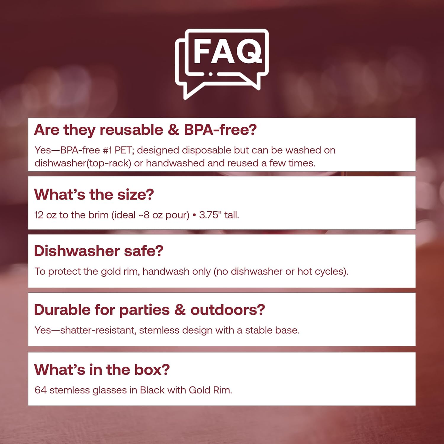 • DISPOSABLE OR REUSABLE CONVENIENCE – Choose between disposable wine glasses for easy cleanup or reusable plastic wine glasses for multiple events, adding flexibility to your hosting needs.