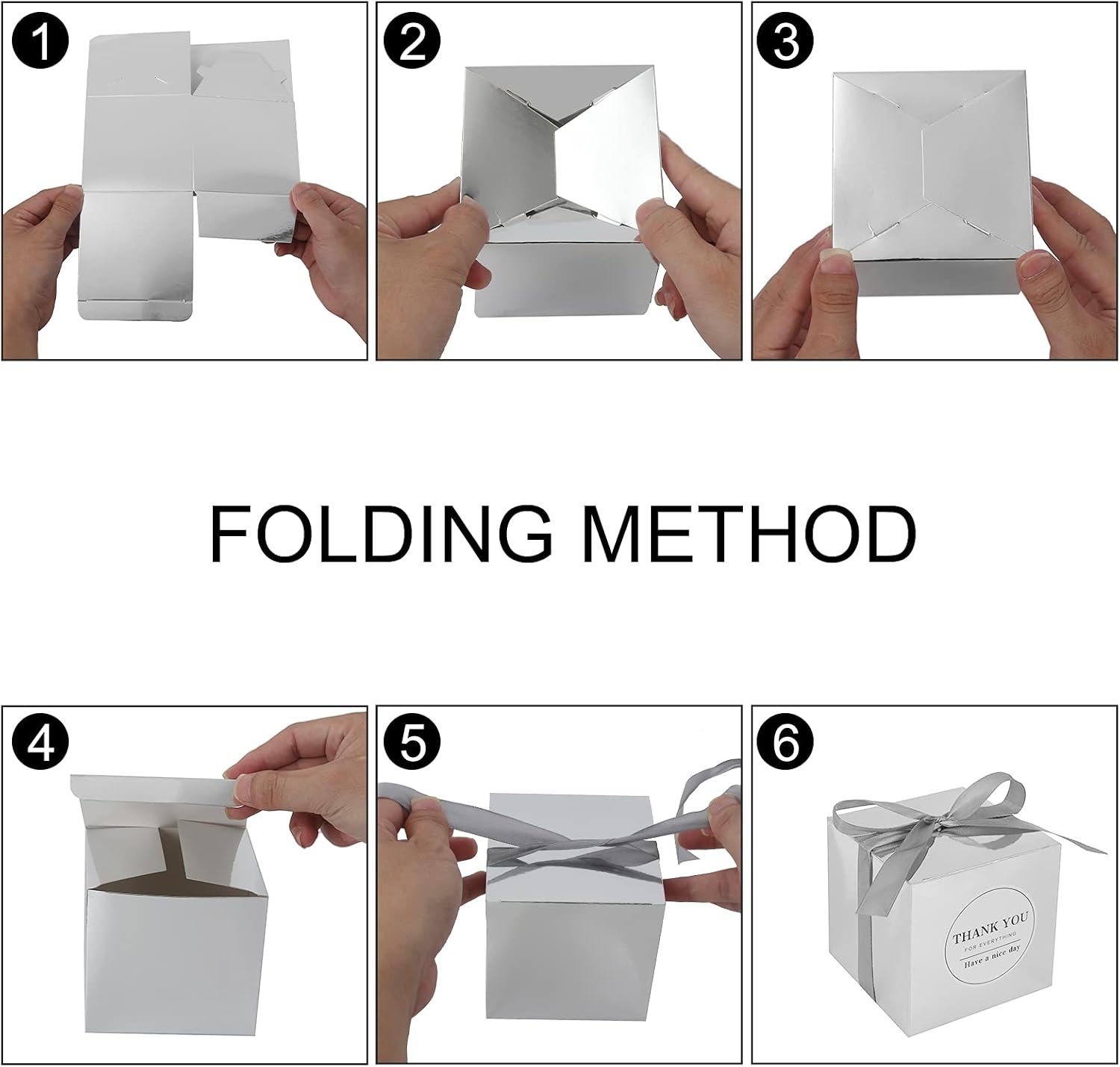 • What You'll Get: 100pcs Metallic Silver favor boxes,100pcs slver ribbons and 100pcs Thank you stickers. you can tie a bow knot on top, which will be more elegant and romantic for party.