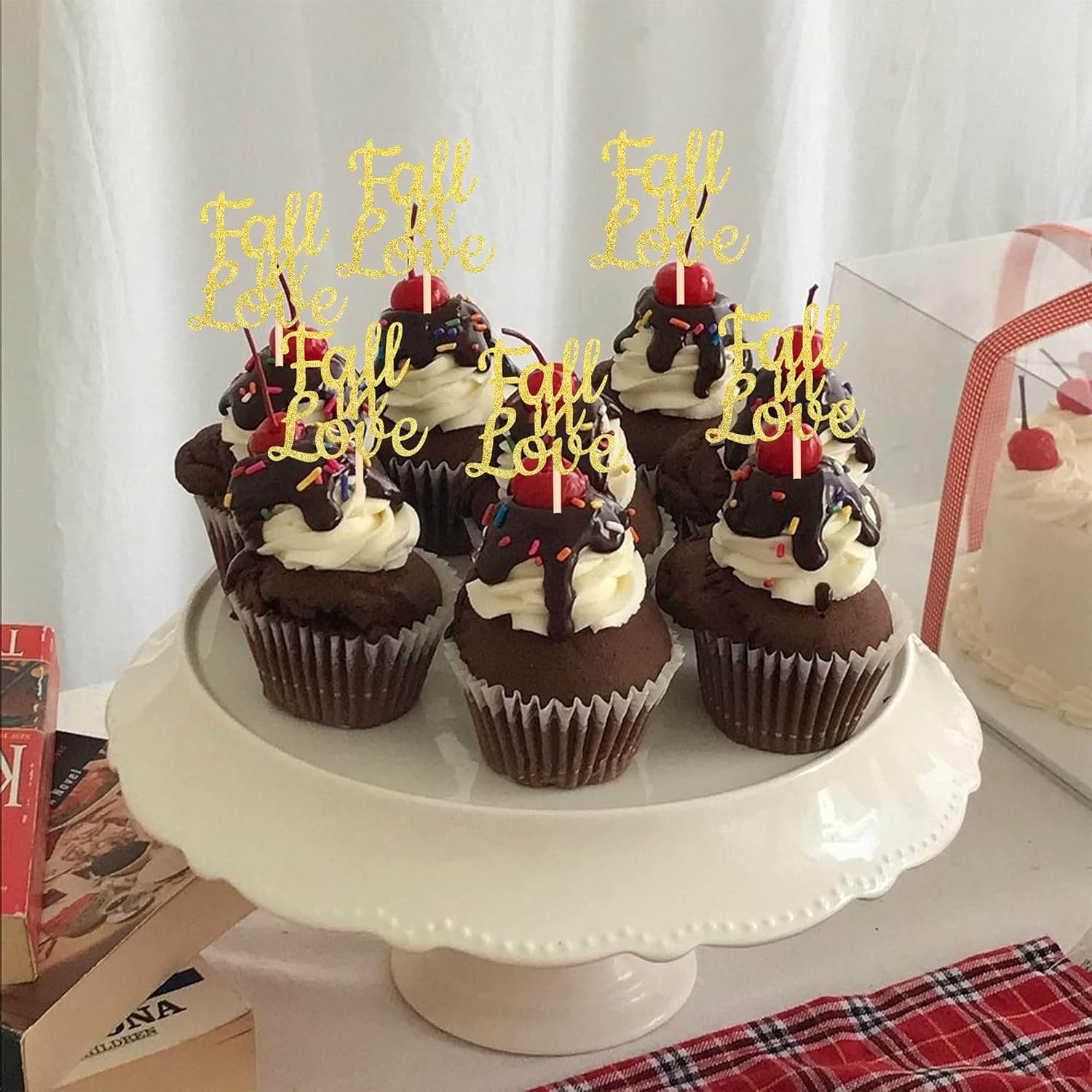 24 PCS Fall in Love Cupcake Toppers Glitter Bridal Shower Cupcake Picks Wedding Engagement Anniversary Birthday Party Cake Decorations Supplies