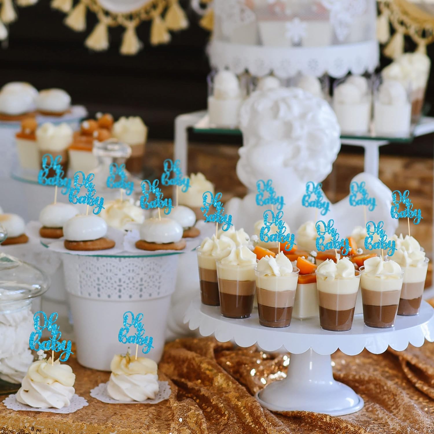 Gyufise 36 Pack Blue Glitter Oh Baby Cake Cupcake Toppers Picks for Wedding Birthday Baby Shower Party Decorations