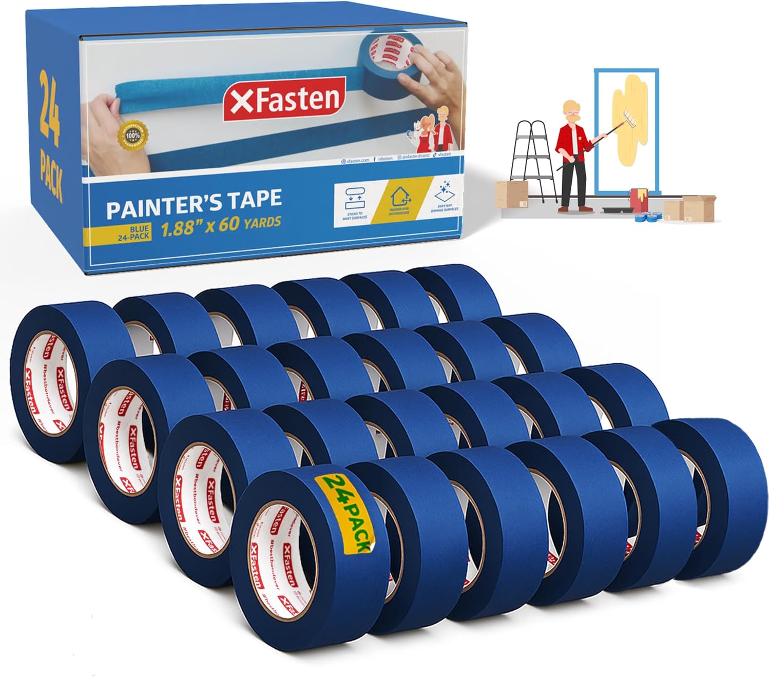 XFasten Blue Painters Tape Bulk, 1.88 Inch x 60 Yards, 1440 Yards Total (24-Pack) Blue Painters Masking Tape Bulk - Sharp Edge Line Technology, Produces Sharp Lines | Residue-Free Wall Trim Tape