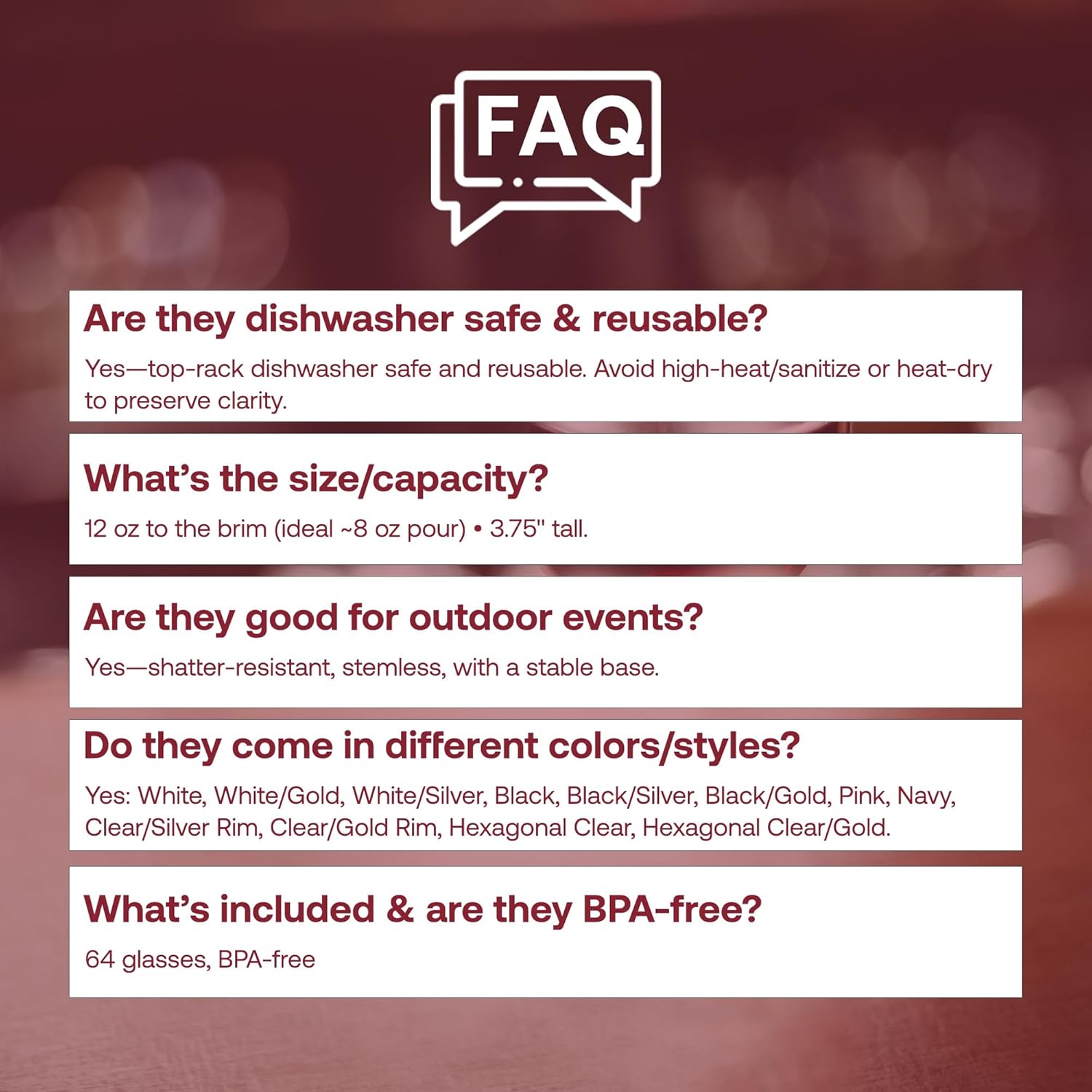 • BULK SET FOR LARGE GATHERINGS – This pack of 64 plastic stemless wine glasses provides ample drinkware for bigger events, ensuring every guest has a stylish glass to enjoy.