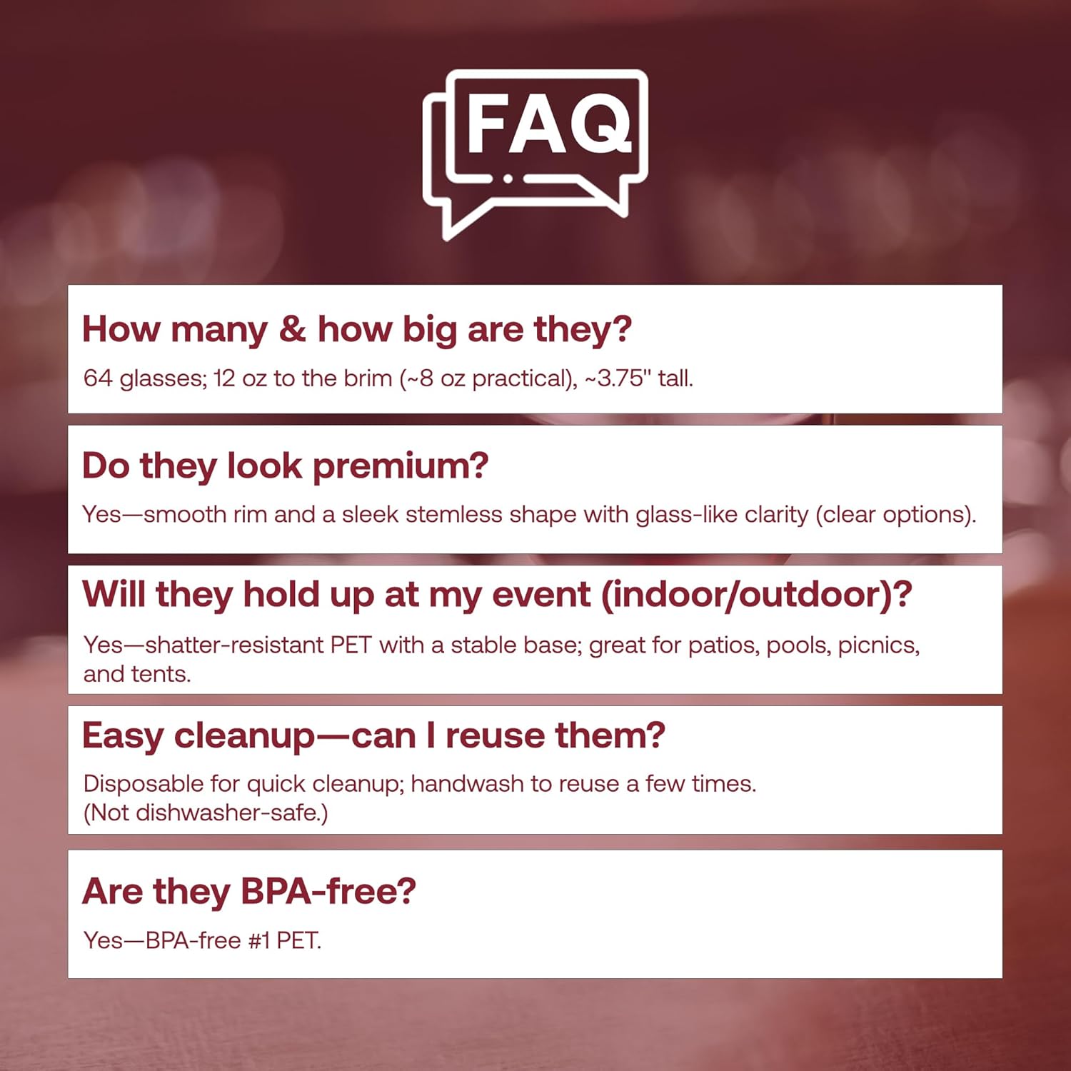 • PACK & CAPACITY: Case of 64 black disposable stemless wine glasses (4 packs of 16). Flush 12 oz, practical 8 oz—elegant fancy plastic cups for receptions, showers, holidays, and everyday entertaining.