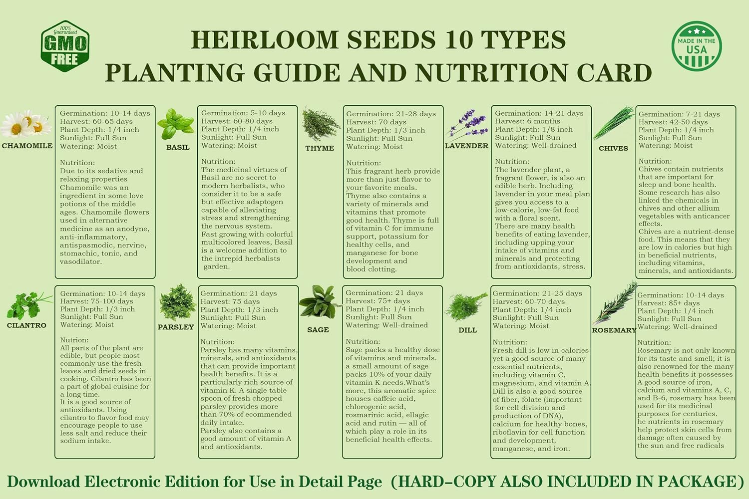 • DIY A SMALL INDOOR HERB GARDEN: We provides seeds that grow into Chamomile, Basil, Parsley, Rosemary, Thyme, Lavender, Chives, Cilantro, Sage, and Dill. All these herbs seeded on your own would be safer and greener to eat, and very suitable to be put on the kitchen's windowsill especially so that you can get and cook with the freshly plucked.