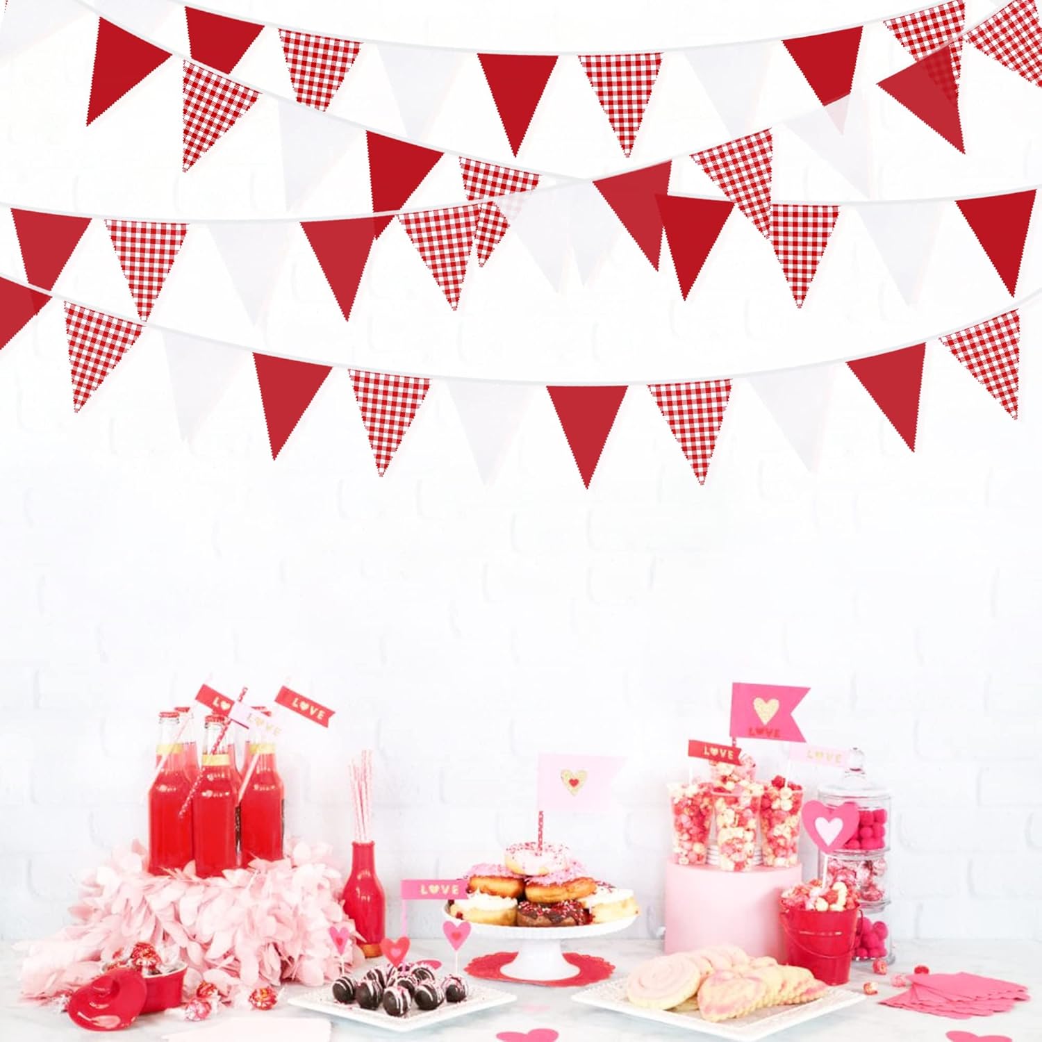 32Ft Red Party Decorations Red Plaid Checkered White Triangle Flag Gingham Pennant Bunting Fabric Garland for Christmas Wedding Birthday Carnival Picnic X-mas Outdoor Home Party Festivals Decoration